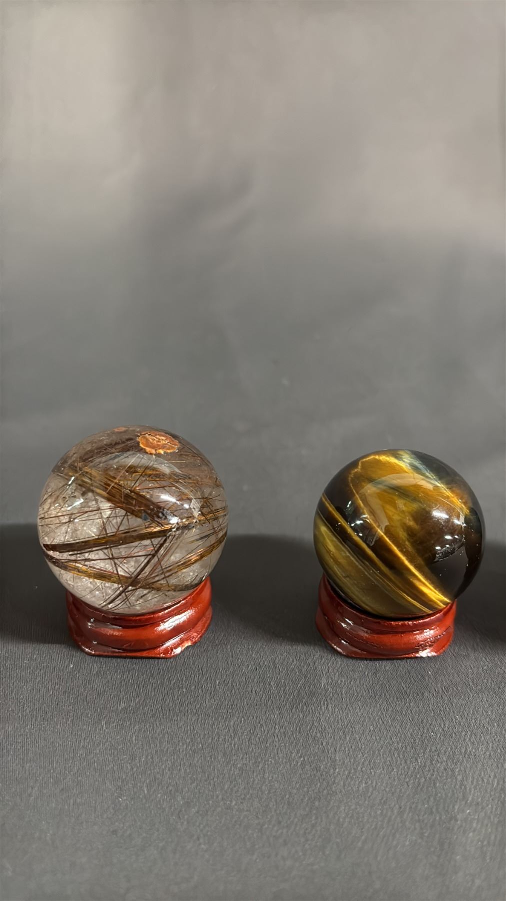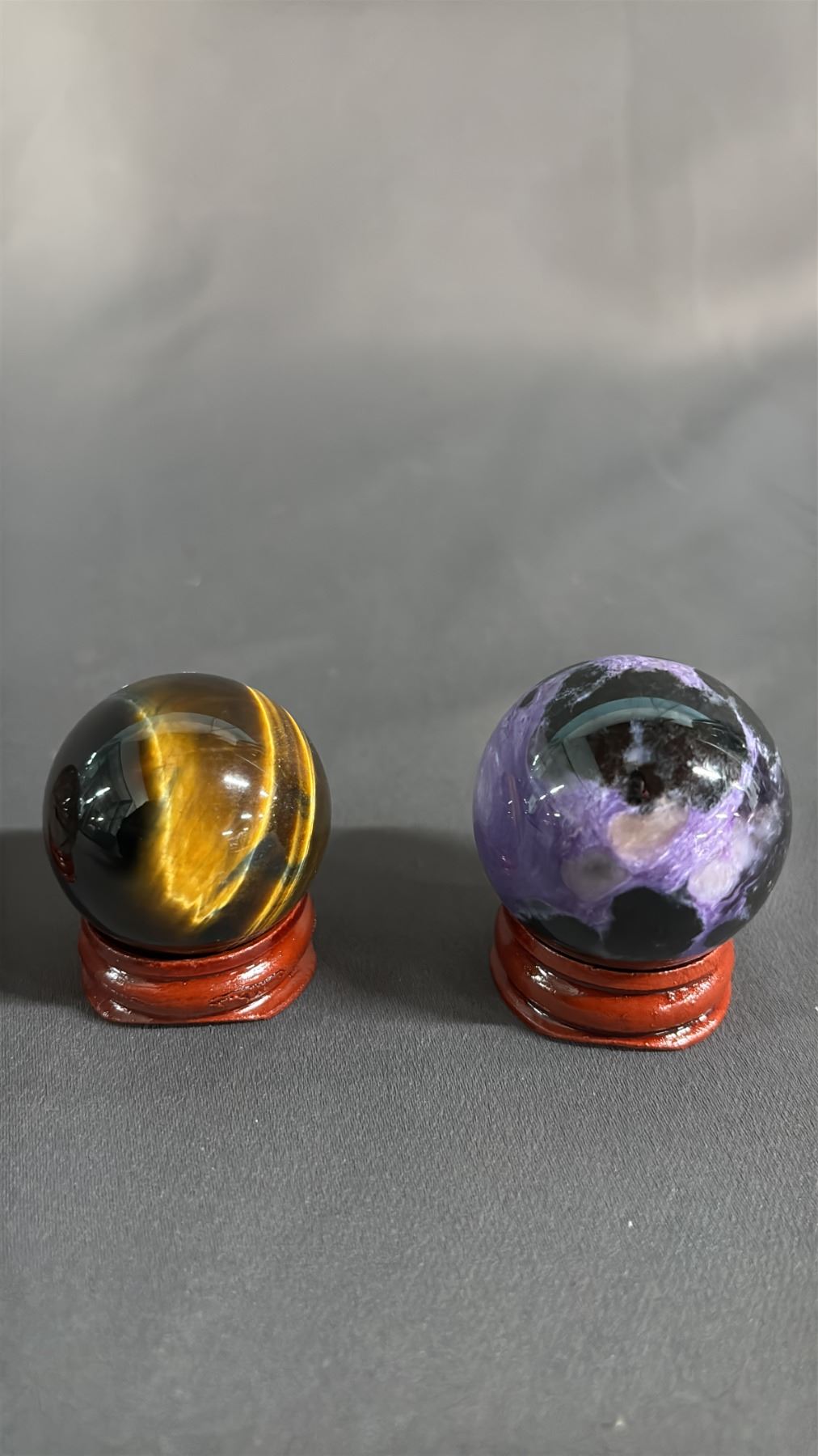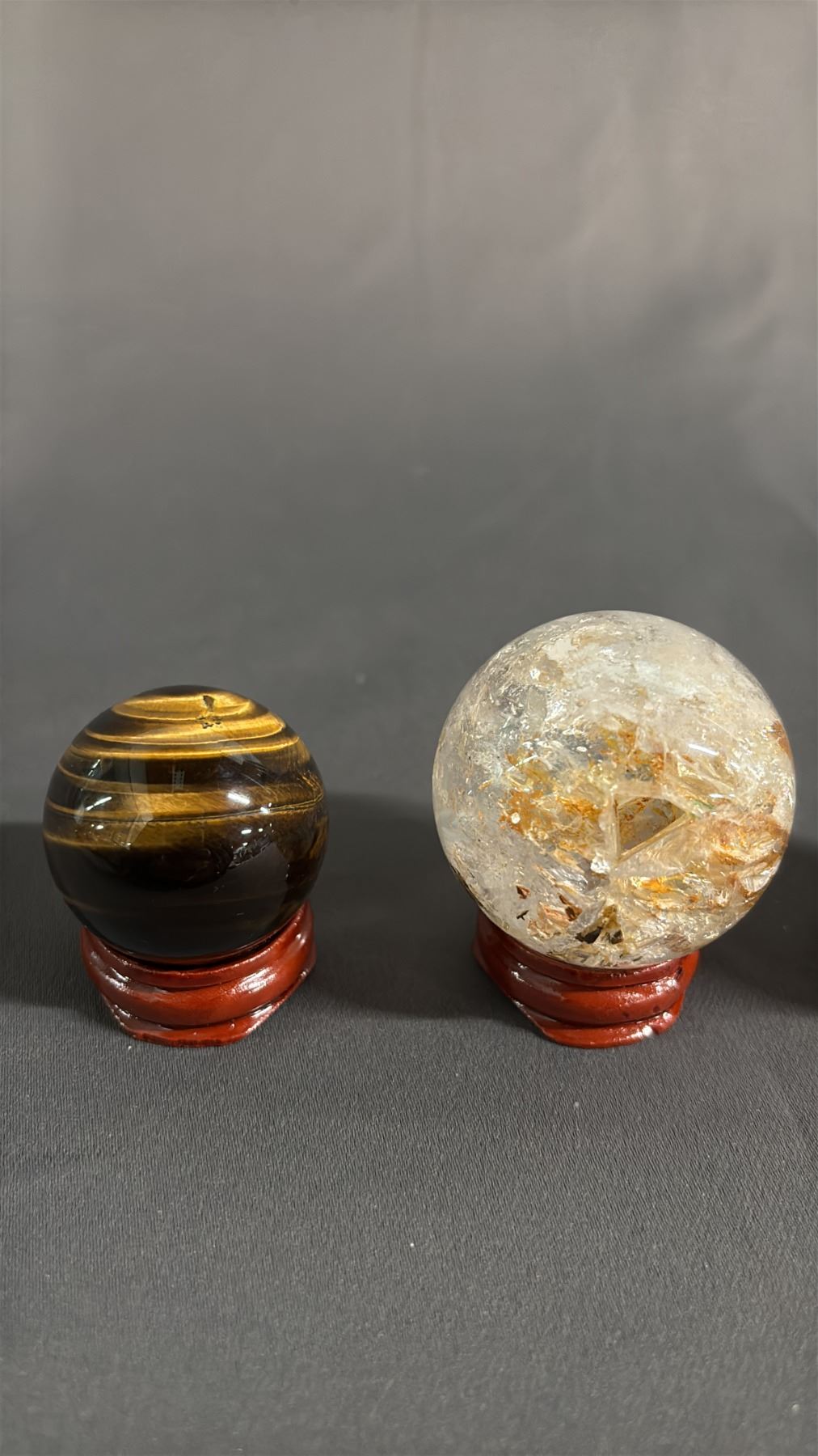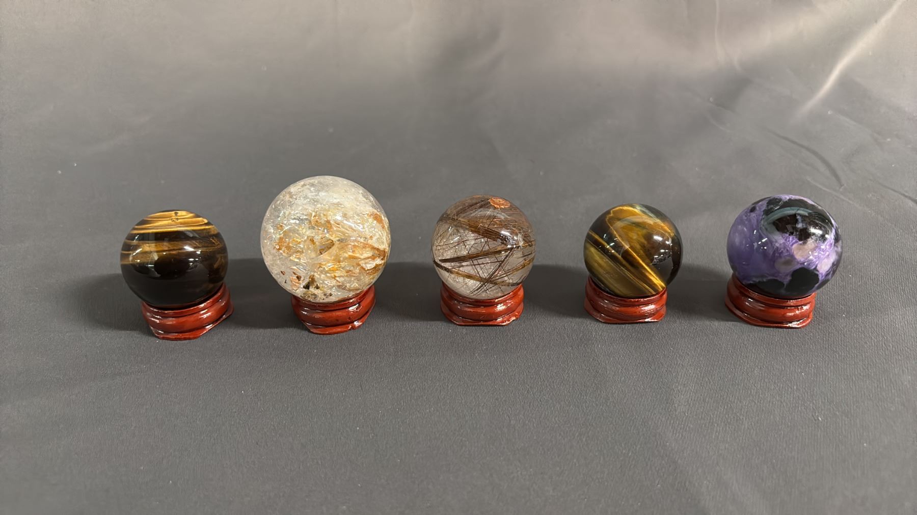 (5) TIGER'S EYE, AMETHYST, SMOKEY QUARTZ & OTHER SPHERES WITH STANDS: LARGEST IS APPROX. 1"