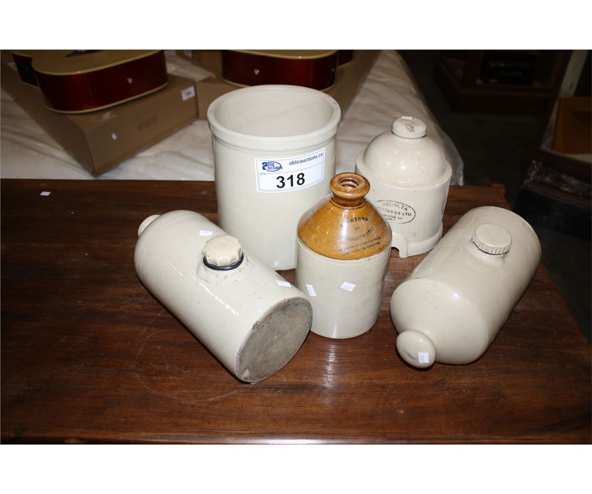 5 VINTAGE STONEWARE PIECES; 2 BEDWARMERS, 1 BIRD FEEDER LID, 1 ONE GALLON CROCK AND 1 JUG