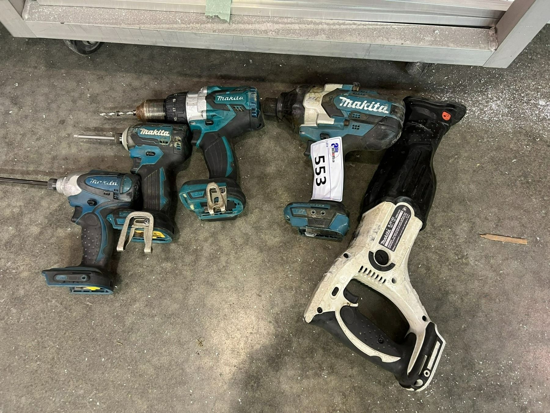 5 X MAKITA 18V TOOLS - MODEL VJR182 SABER SAW, MODEL VTW800 IMPACT GUN, MODEL VHP431 1/2" HAMMER DRILL, MODEL BTD 170 IMPACT DRILL, BTD141 IMPACT DRILL