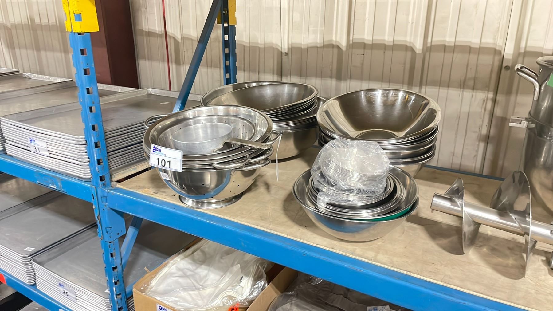 50 ASSORTED STAINLESS STEEL COMMERCIAL KITCHEN BOWLS, 4 COMMERCIAL COLANDERS & SMALL POT