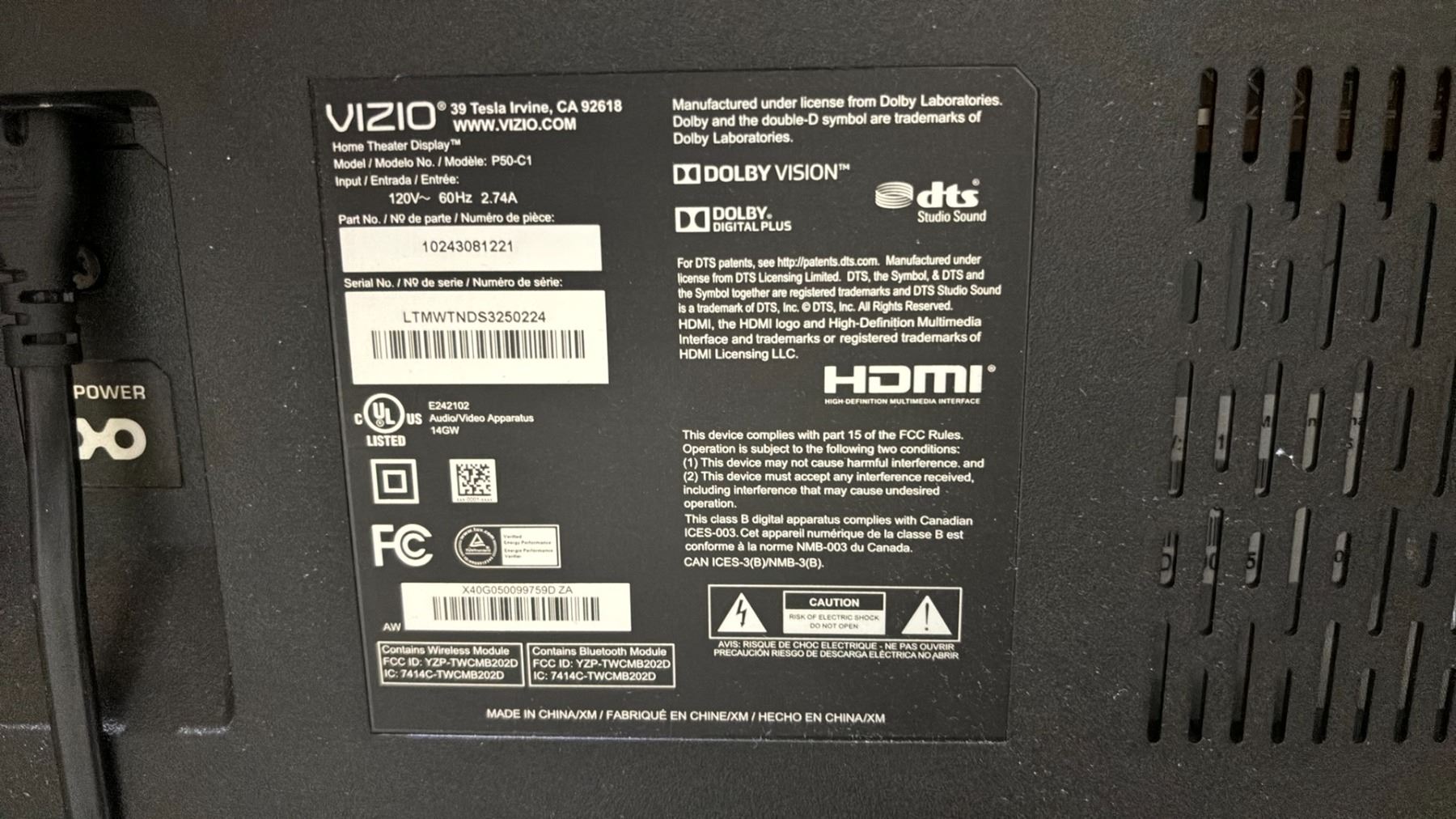 50" VIZIO TV *TESTED WORKING/ NO POWER CORD/ NO REMOTE*