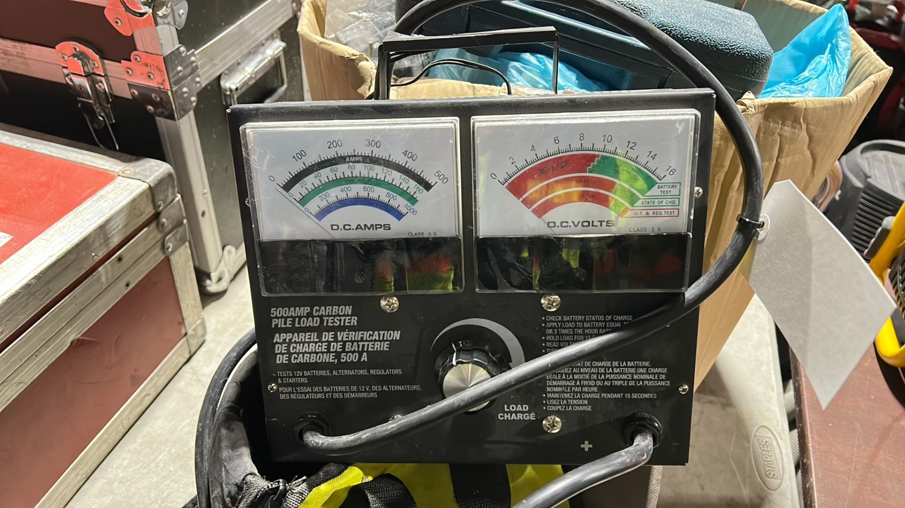 500AMP CARBON PILE LOAD TESTER, MASTERCRAFT POCKET DIGITAL MULTIMETER IN A HARD CASE & A BOX FULL OF ASTRO "DELTA" CLAMPS 1" FULL CLAMP WITH NAIL
