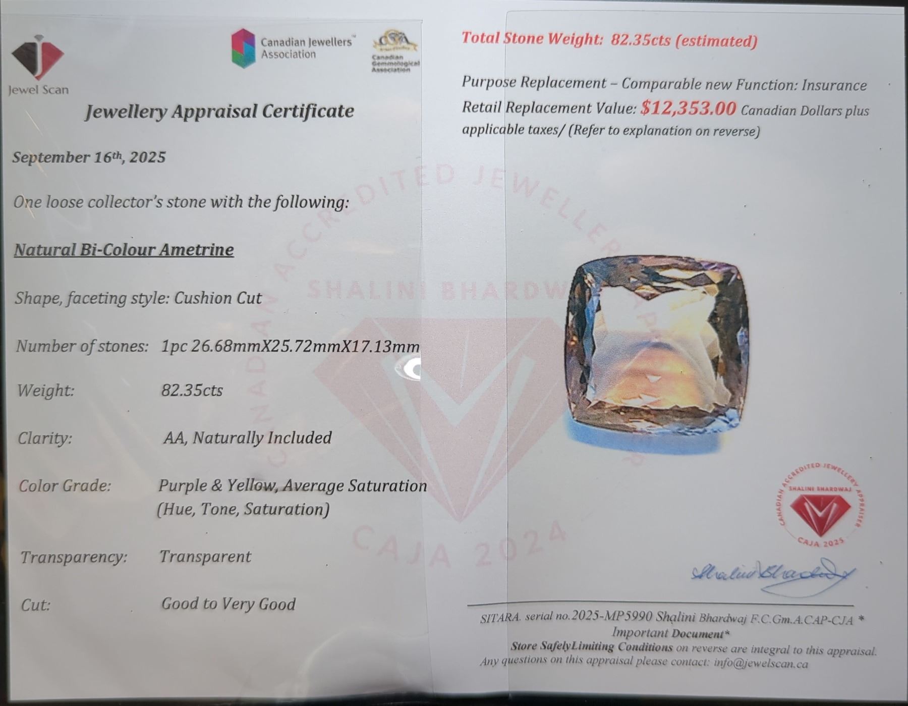 57.95 CT CERTIFIED BI-COLOUR AMETRINE GEMSTONE ($12,353 APPRAISAL, APPRAISAL NOT GUARANTEED)