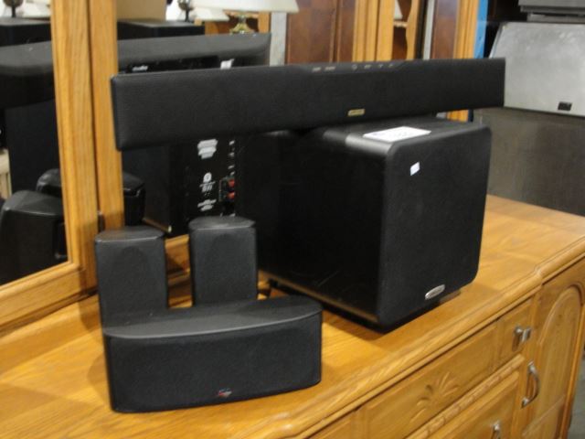 5PC POLK AUDIO SPEAKER SYSTEM; POWERED SUBWOOFER, SOUNDBAR AND 3 SPEAKERS