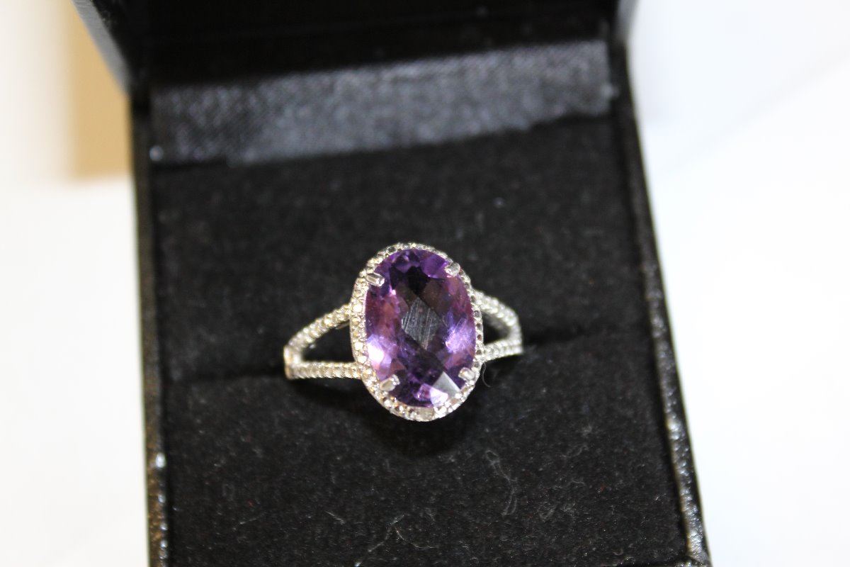 6.45 CARAT CHECKERBOARD CUT AMETHYST RING SET WITH DIAMOND STERLING SILVER INCLUDES $375 CERTIFICATE