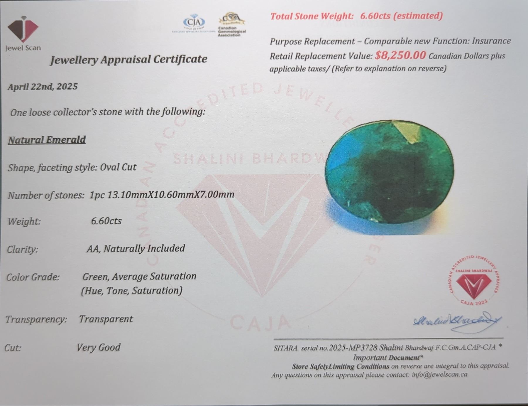 6.6 CT CERTIFIED EMERALD GEMSTONE ($8,250 APPRAISAL, APPRAISAL NOT GUARANTEED)