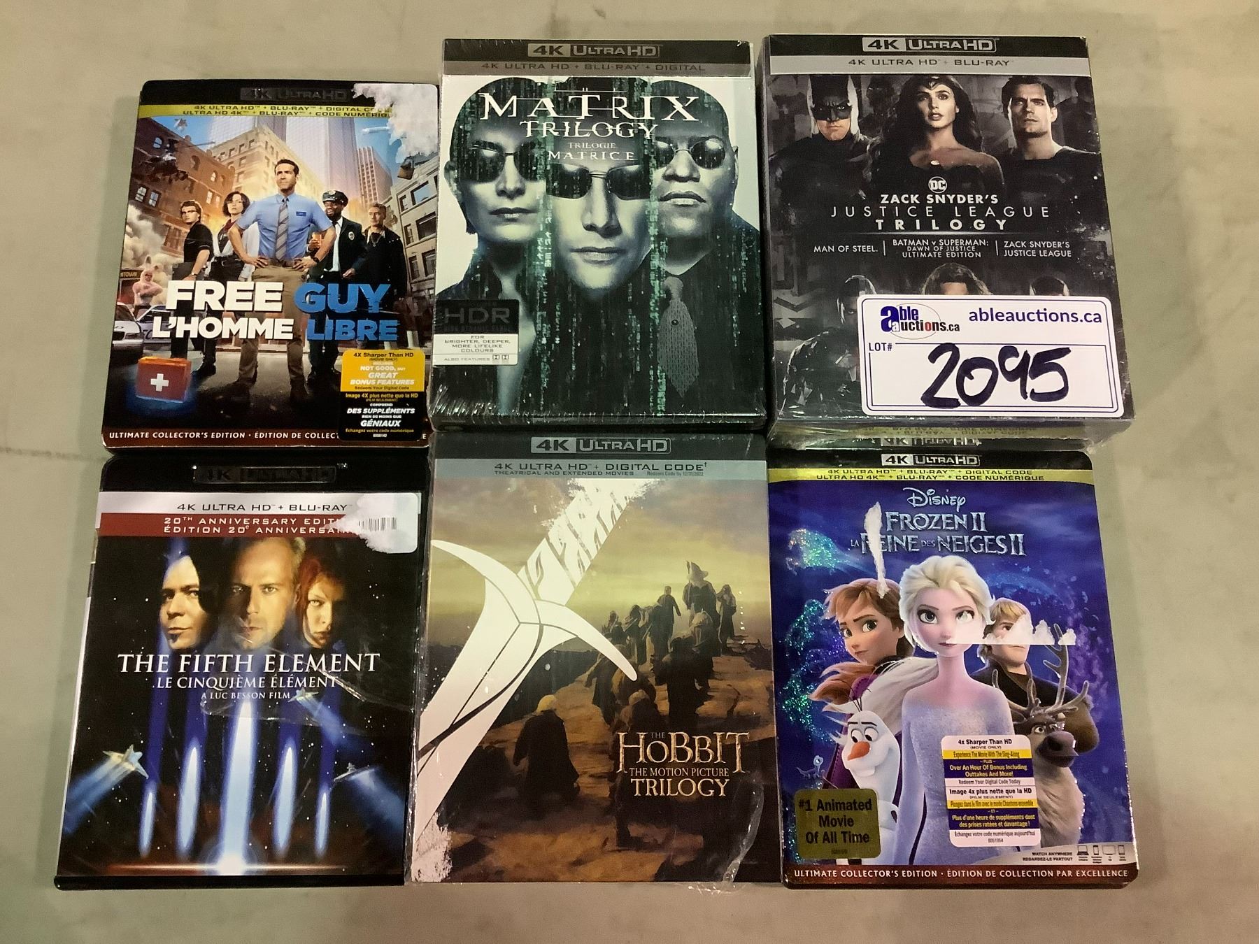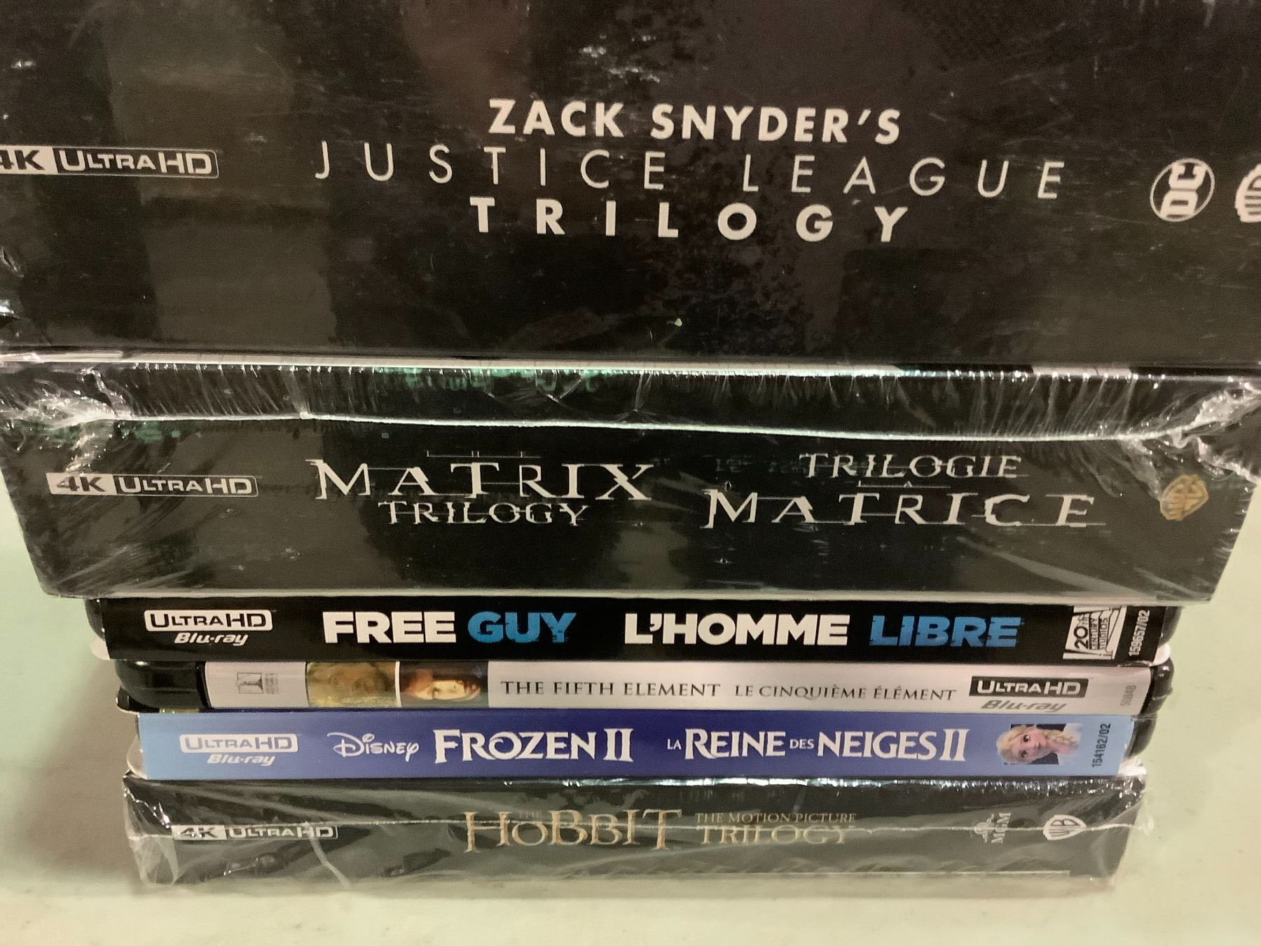 6 ASSORTED 4K DVDS: THE HOBBIT, FROZEN 2, FREE GUY, MATRIX TRILOGY, JUSTICE LEAGUE TRILOGY, THE