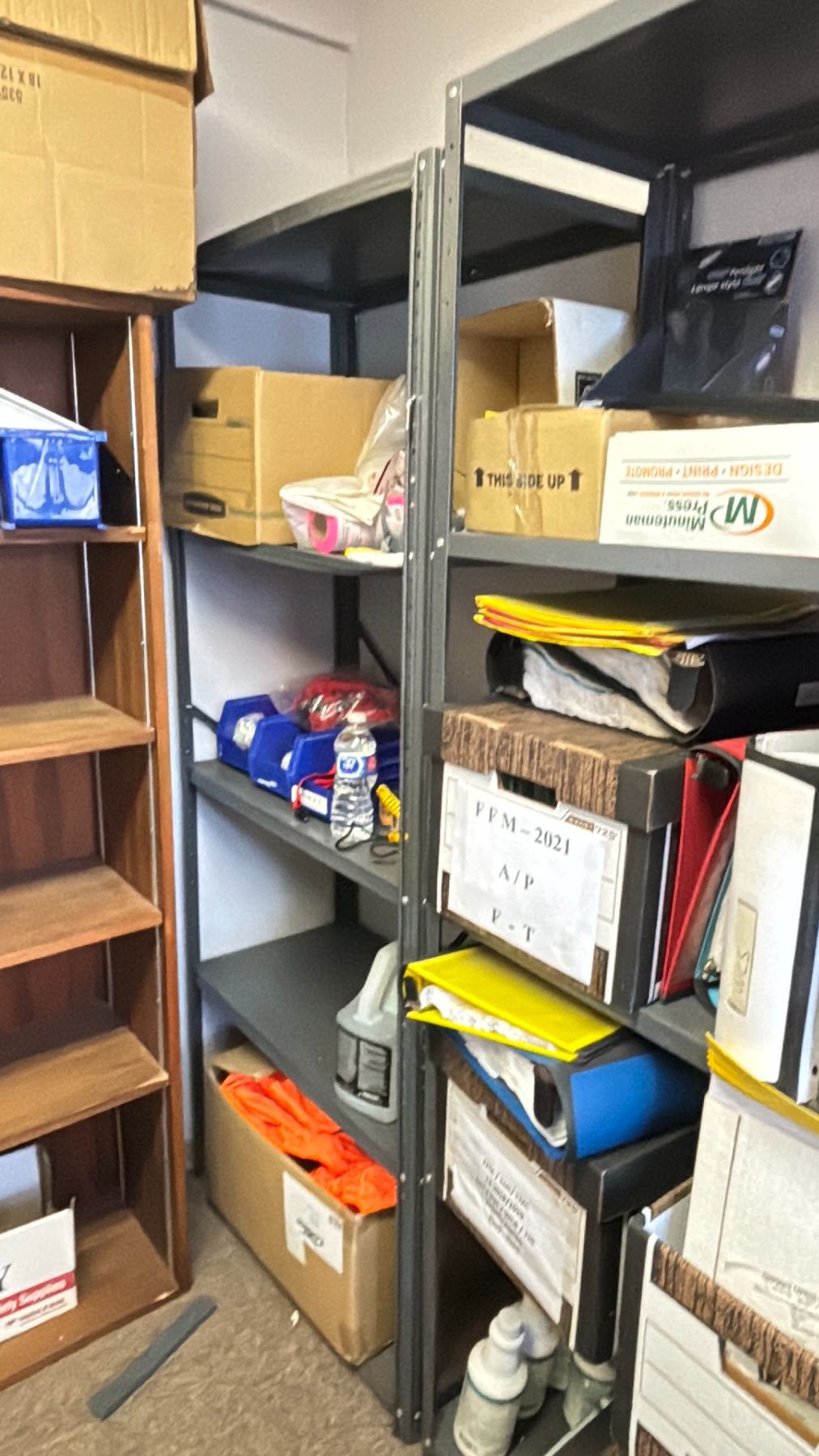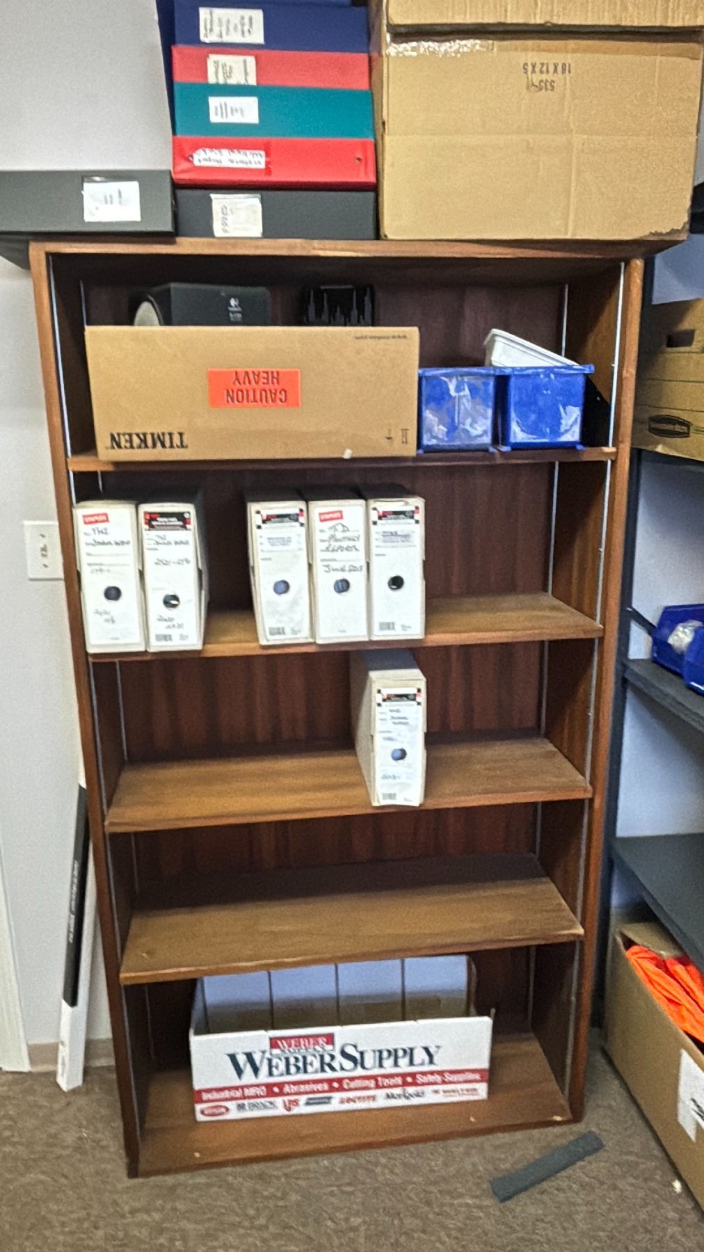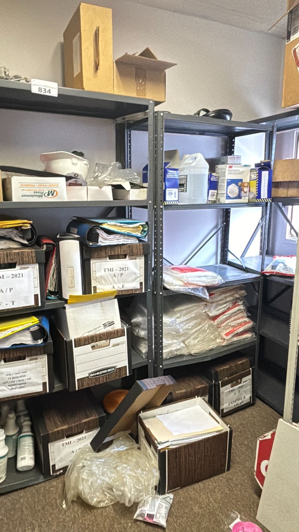 6 ASSORTED SHELVING UNITS ( METAL & WOOD ) WITH ASSORTED MISCELLANEOUS ** NOT INCLUDING ANY BUSINESS FILES/PAPERWORK **