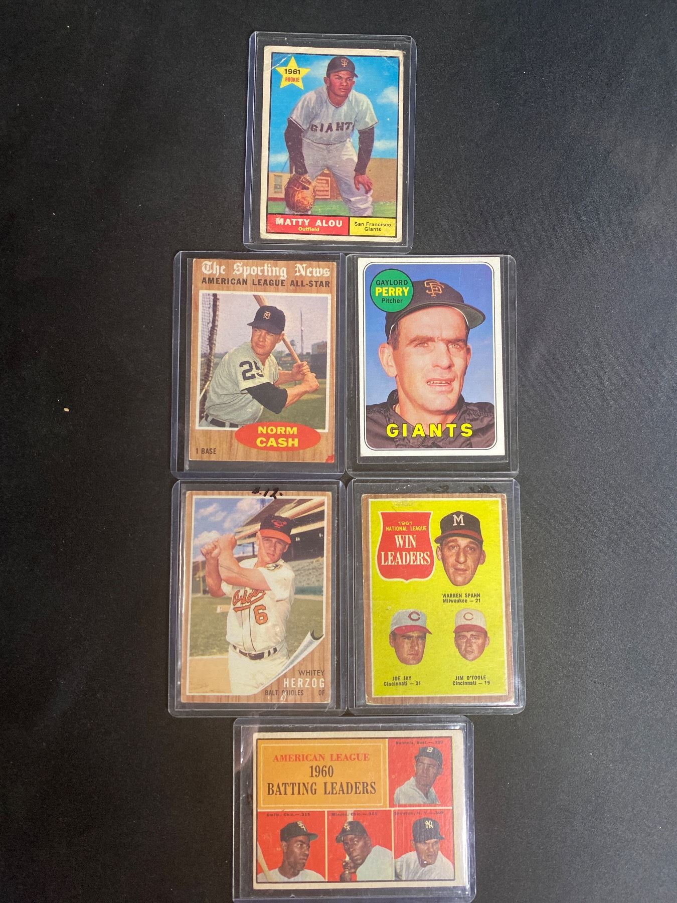 6 ASSORTED TOPPS BASEBALL CARDS NAMES INCLUDE; NORM CASH, GAYLORD PERRY, WHITEY HERZOG, MATTY ALOU AND MORE