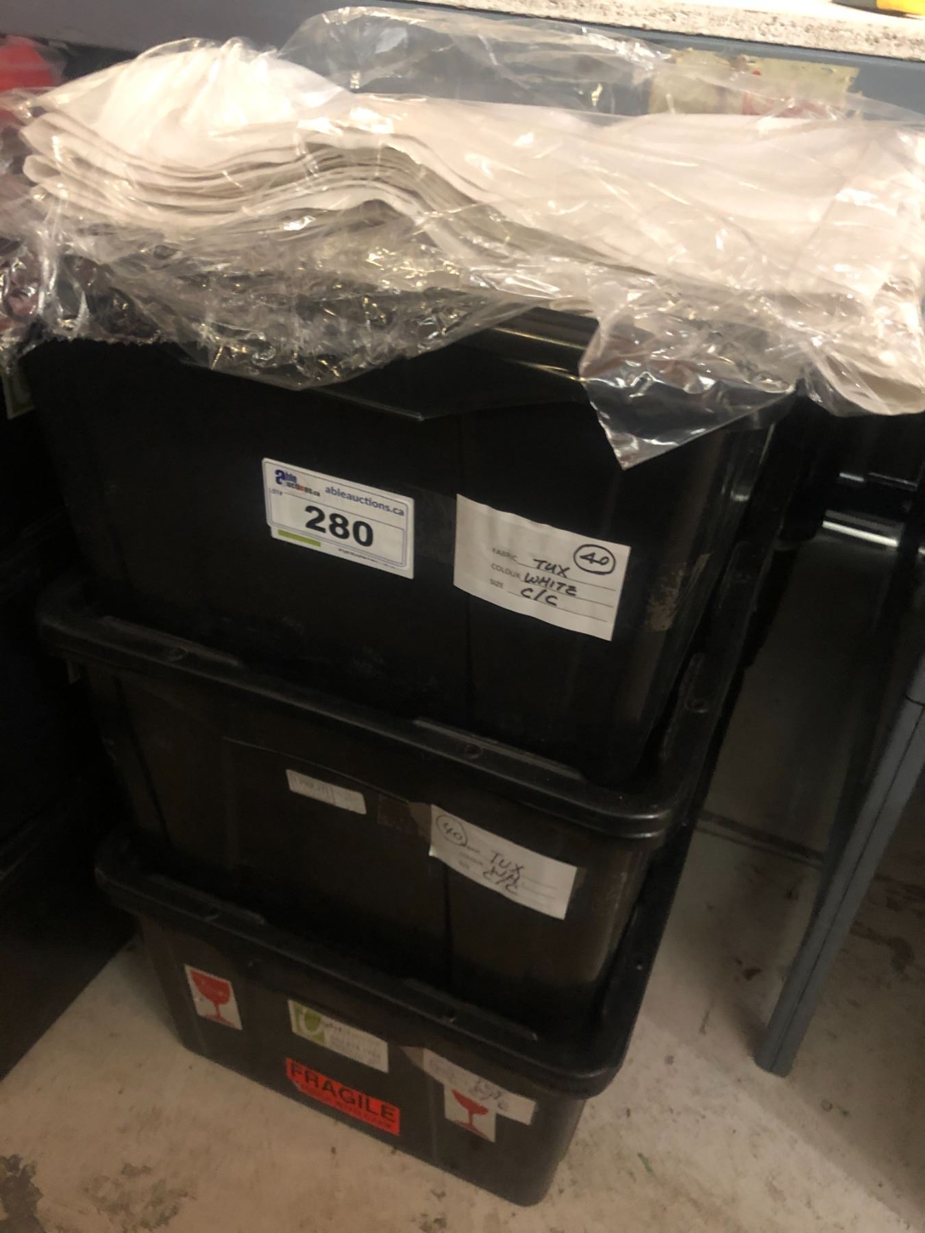 6 BINS OF ASSORTED LINENS, SHAPE/SIZE VARY BETWEEN BINS, COLOURS/PATTERNS INC. TUXEDO AND WHITE