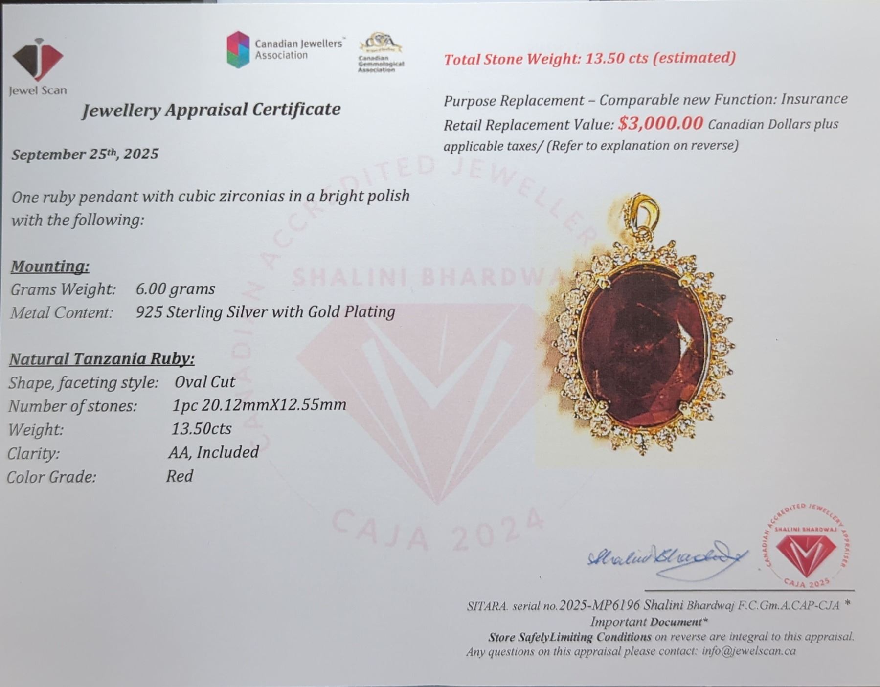 6 CT CERTIFIED SILVER RUBY GEMSTONE PENDANT ($3,000 APPRAISAL, APPRAISAL NOT GUARANTEED)