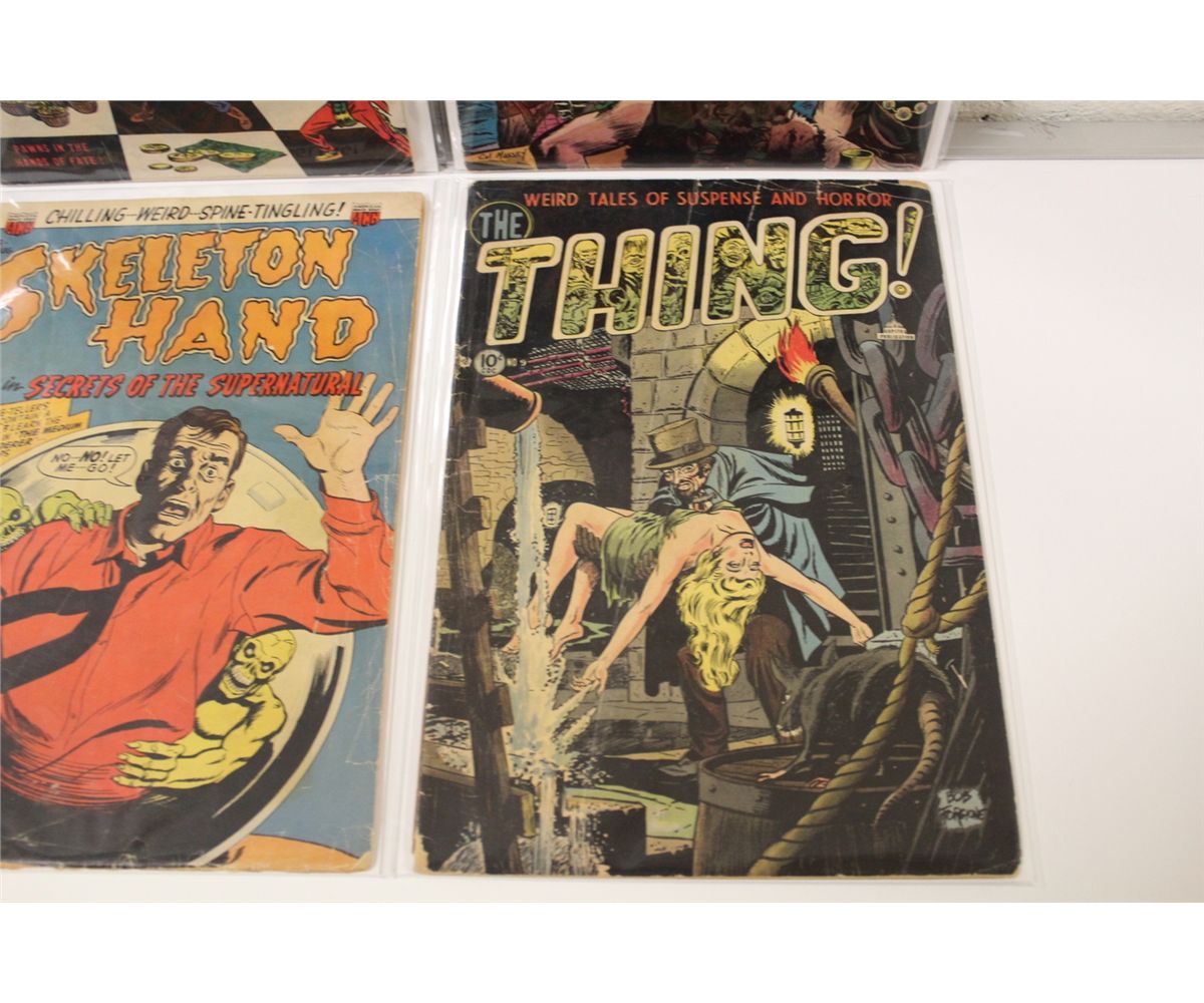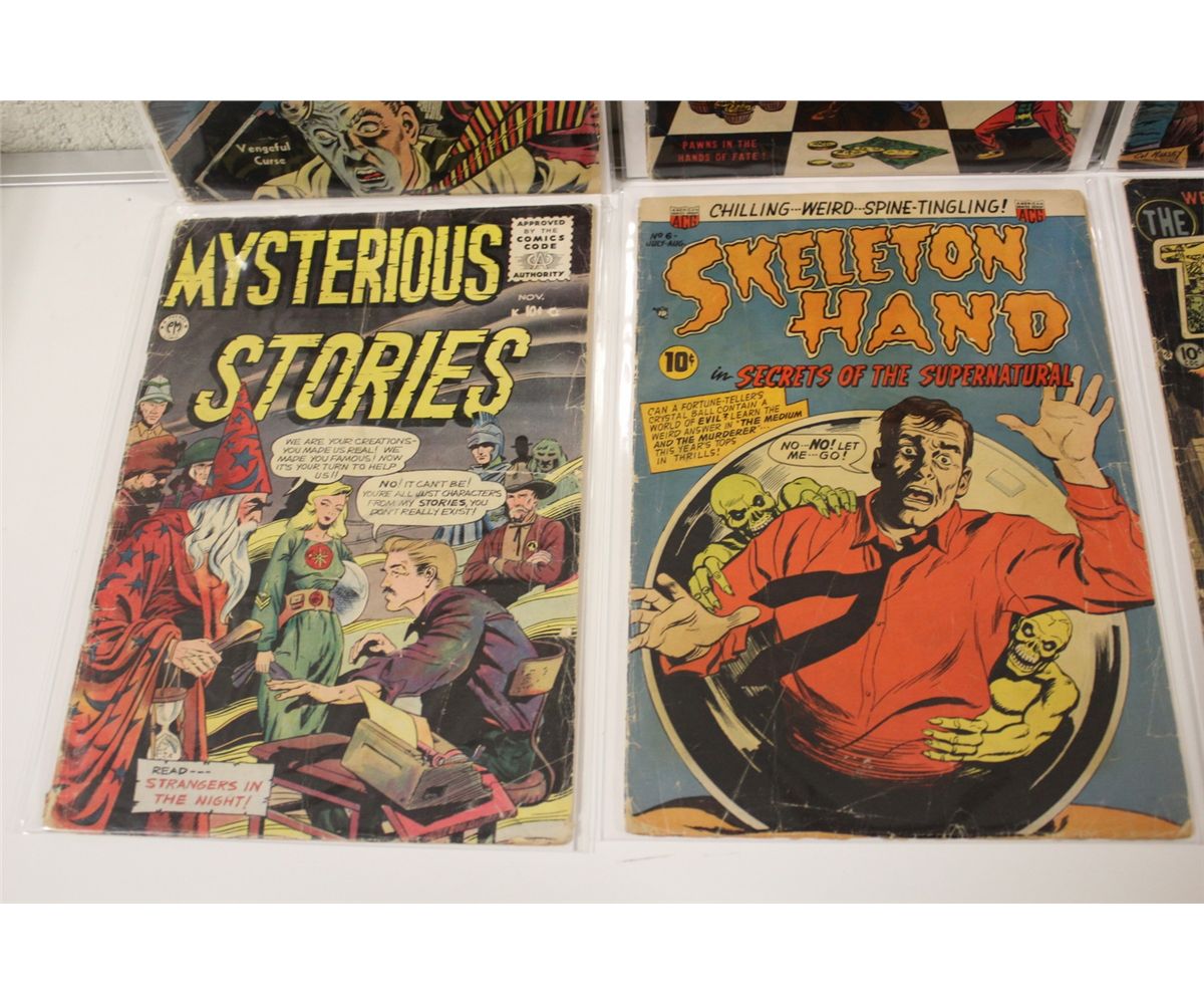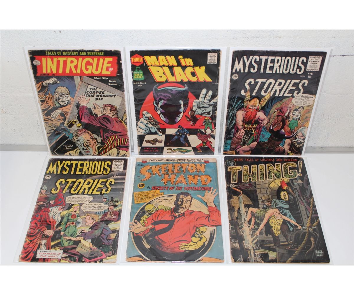 6 GOLDEN AGE HORROR CLASSICS (1952-58) INTRIGUE #1, MAN IN BLACK #4, MYSTERIOUS STORIES #5 & 6, SKELETON HAND #6 & THE THING #9. LOWER GRADE, ALL COMPLETE, NO PIECES OUT, SOLID LOT!