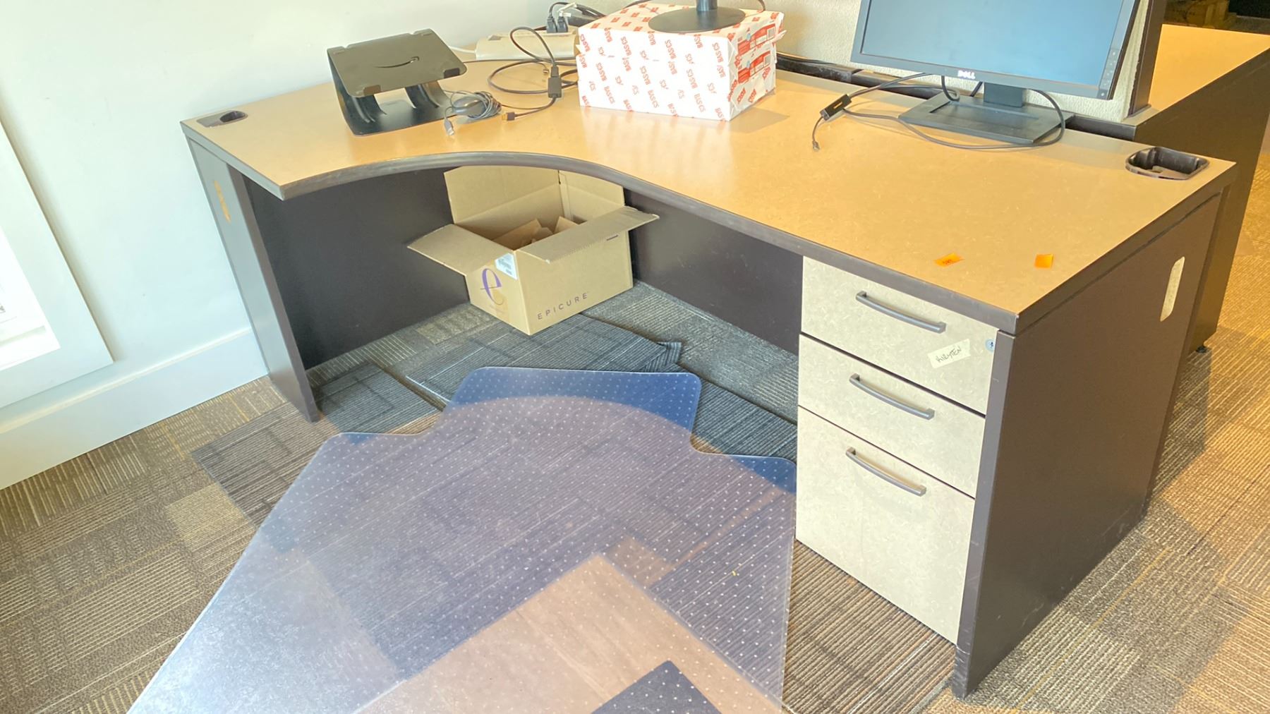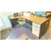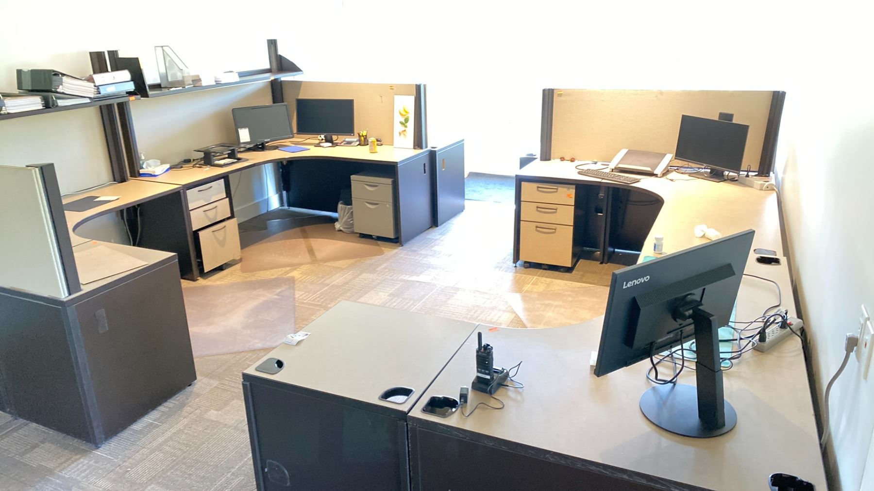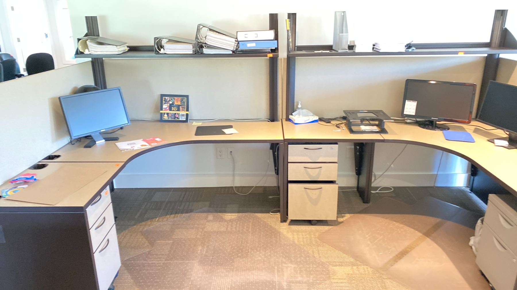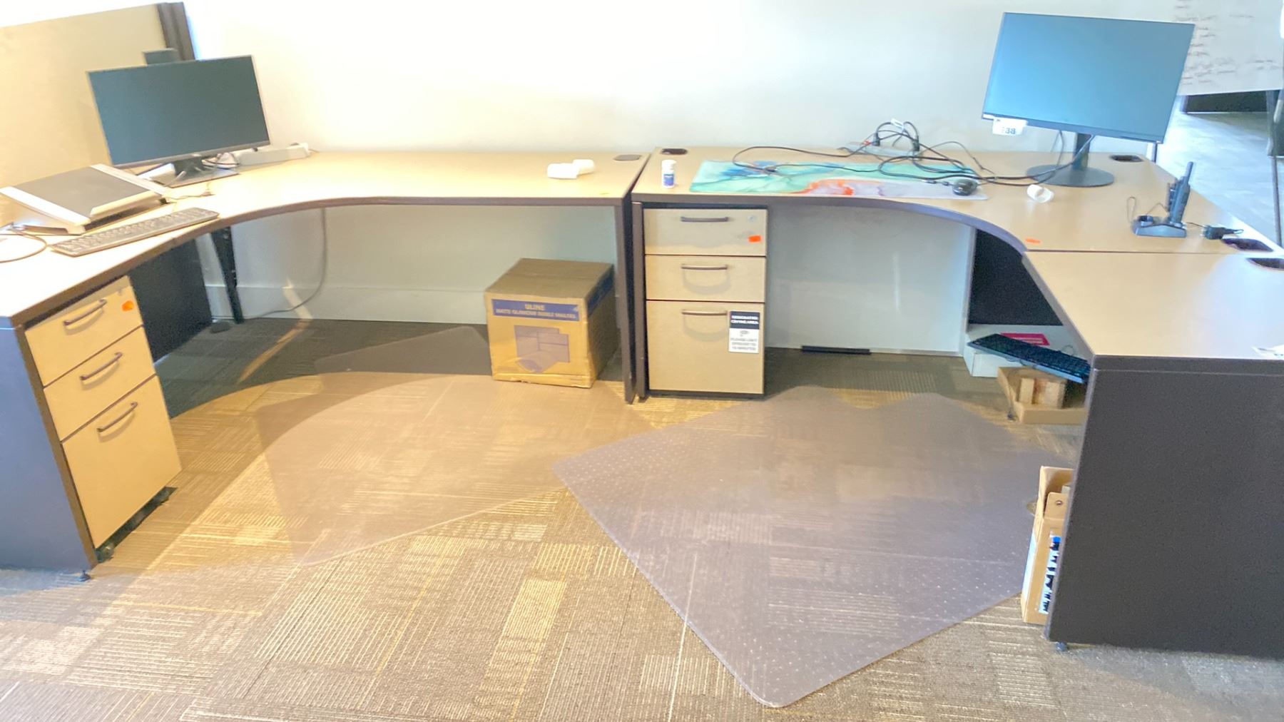 6 L SHAPED DESKS. 3 ARE 66X66, 2 ARE 72X66, 72X42 LOCATED IN HOUSE. ALL HAVE MATCHING DRAWER PEDESTALS. 2 HAVE MATCHING SHELF, SOME DIVIDERS