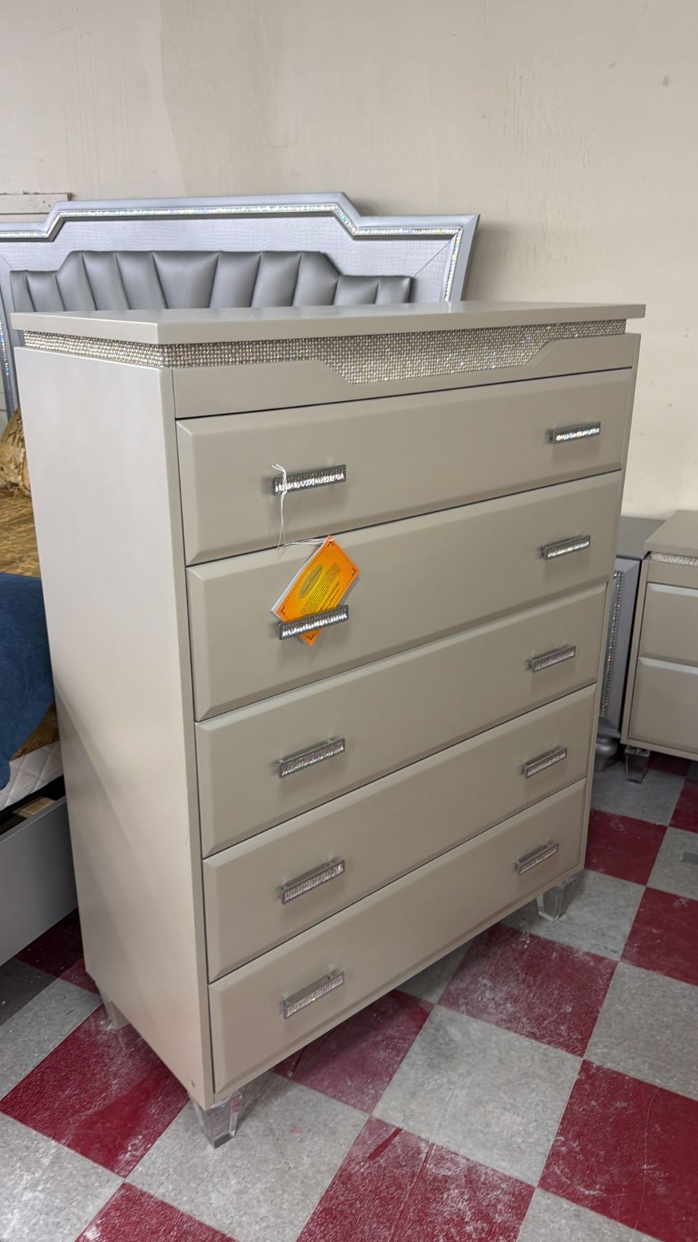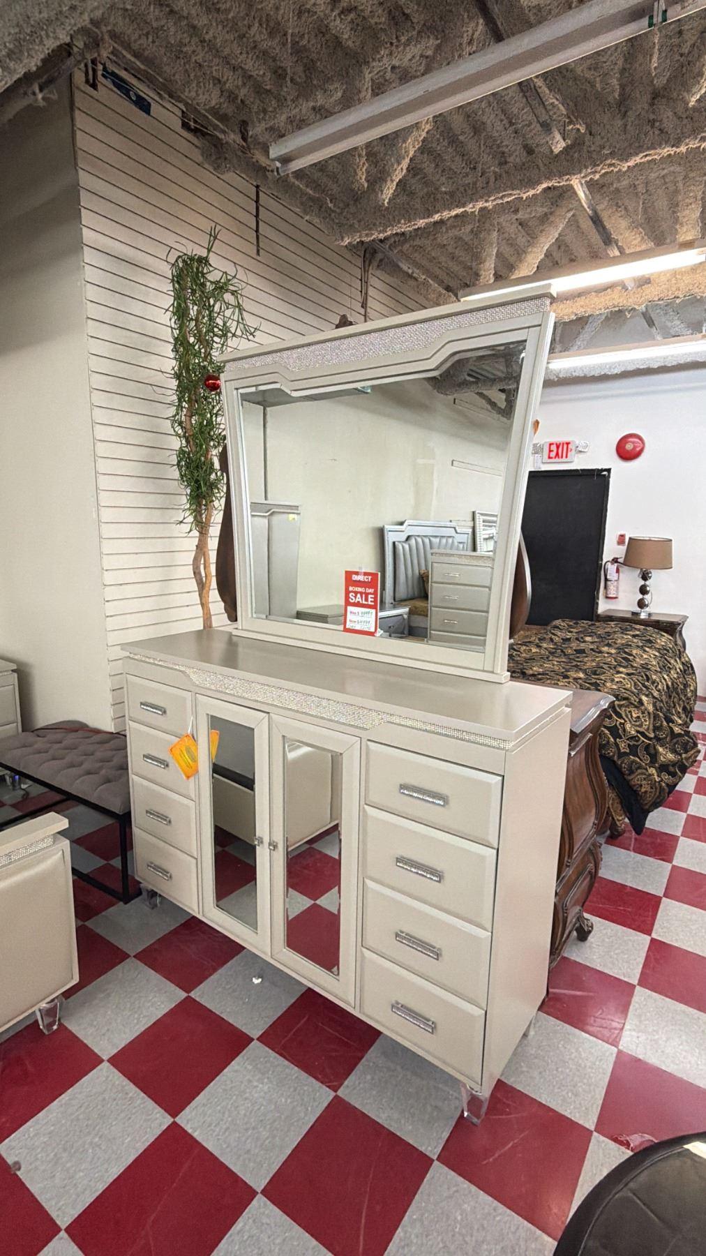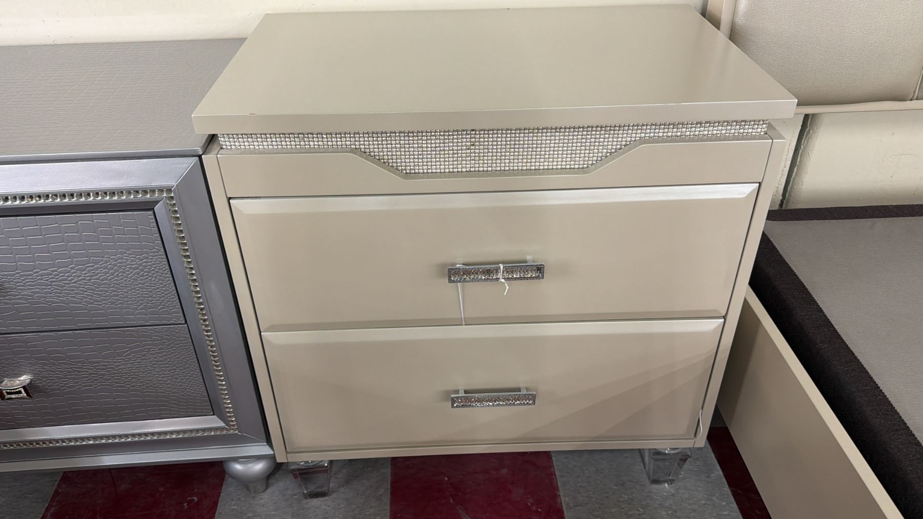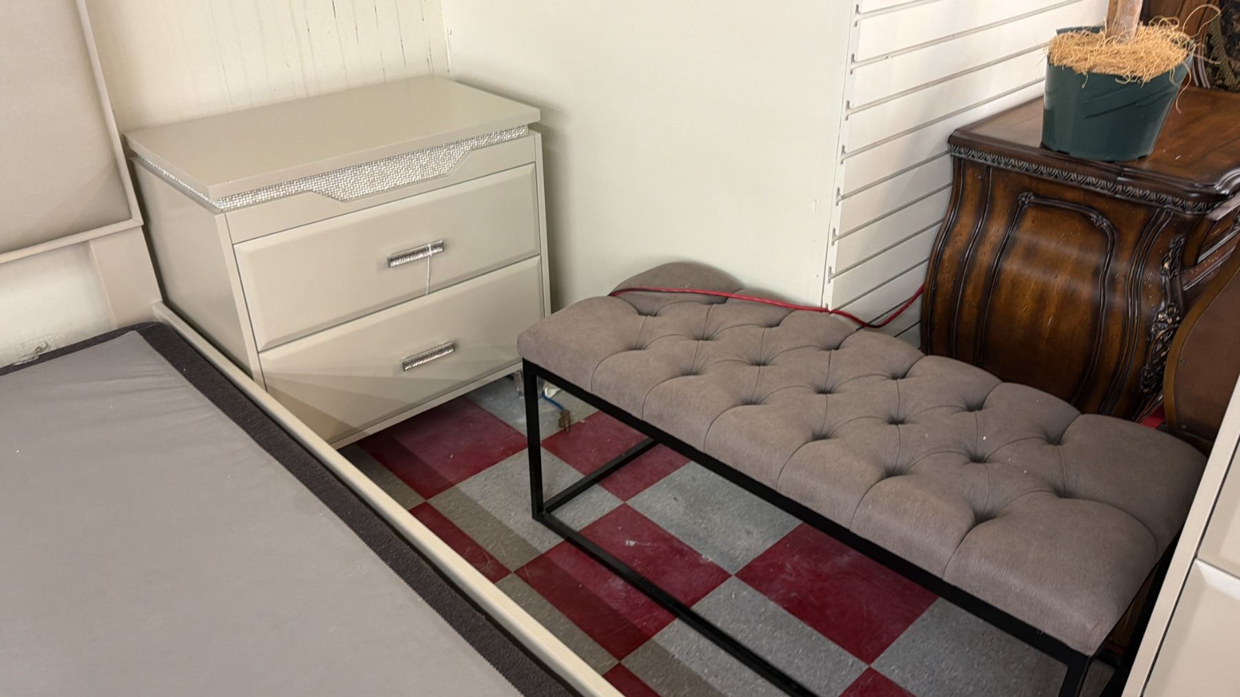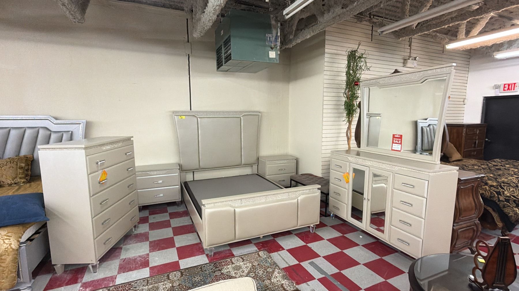 6-PC BEDROOM SUITE INCLUDING; LEATHER QUEEN SIZE BED, VANITY, HIGHBOY DRESSER, (2) SIDE TABLES & FABRIC BENCH