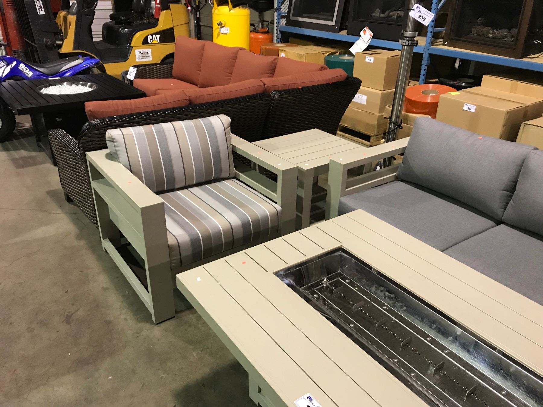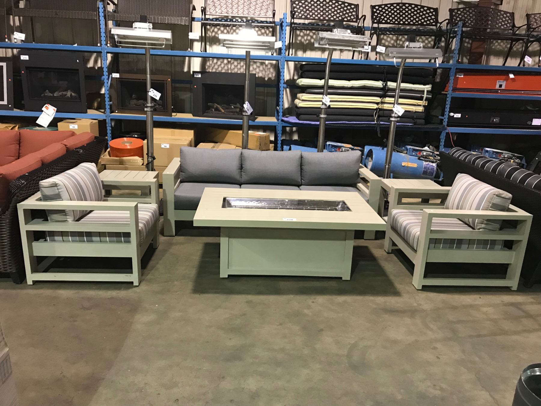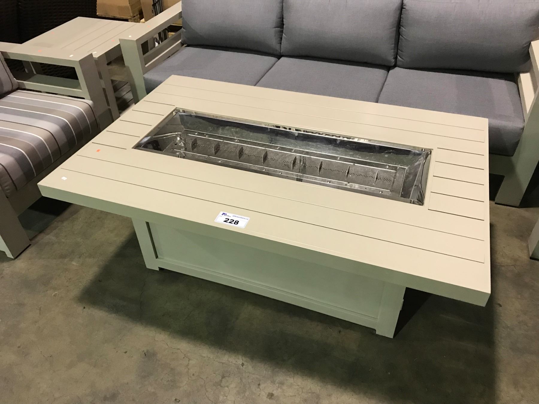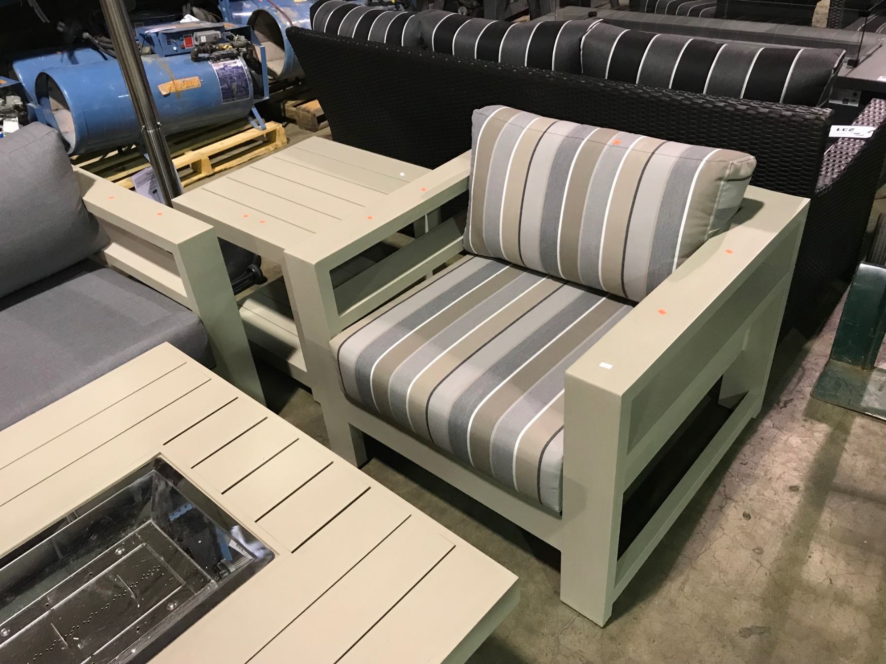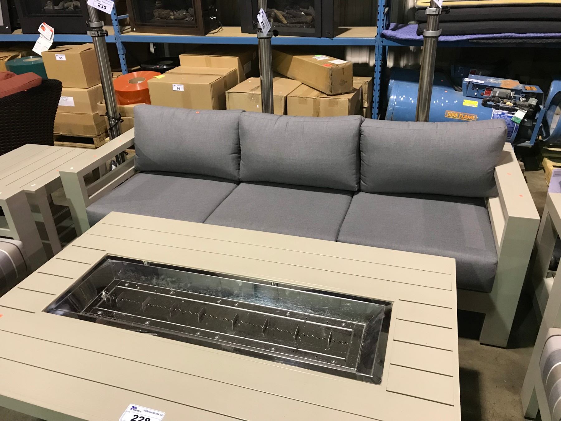 6 PCS CABANA COAST BRUSHED GREY ALUMINUM OUTDOOR PATIO CHAT SET INCLUDING: PROPANE FIRE COCKTAIL TABLE, SOFA, 2 ARM CHAIRS & 2 SIDE TABLES