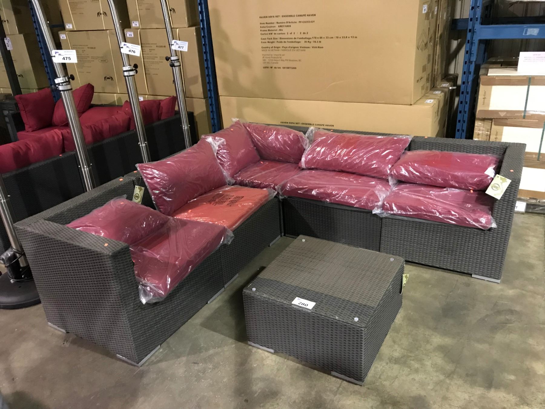 6 PCS HAND CRAFTED GREY PLASTIC RATTAN SECTIONAL SET WITH COCKTAIL TABLE ( ONE NON MATCHING CUSHION)