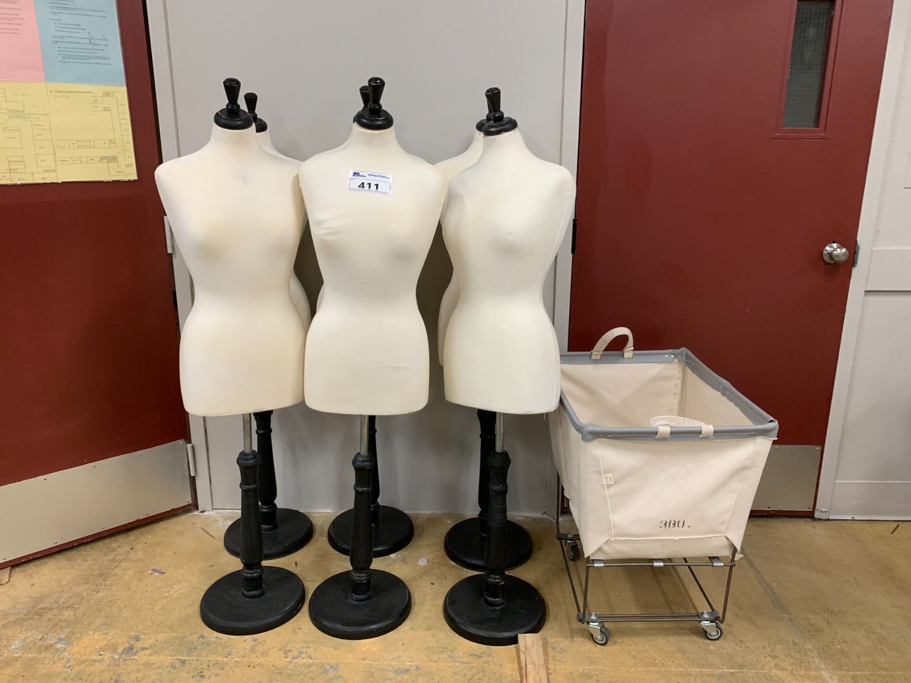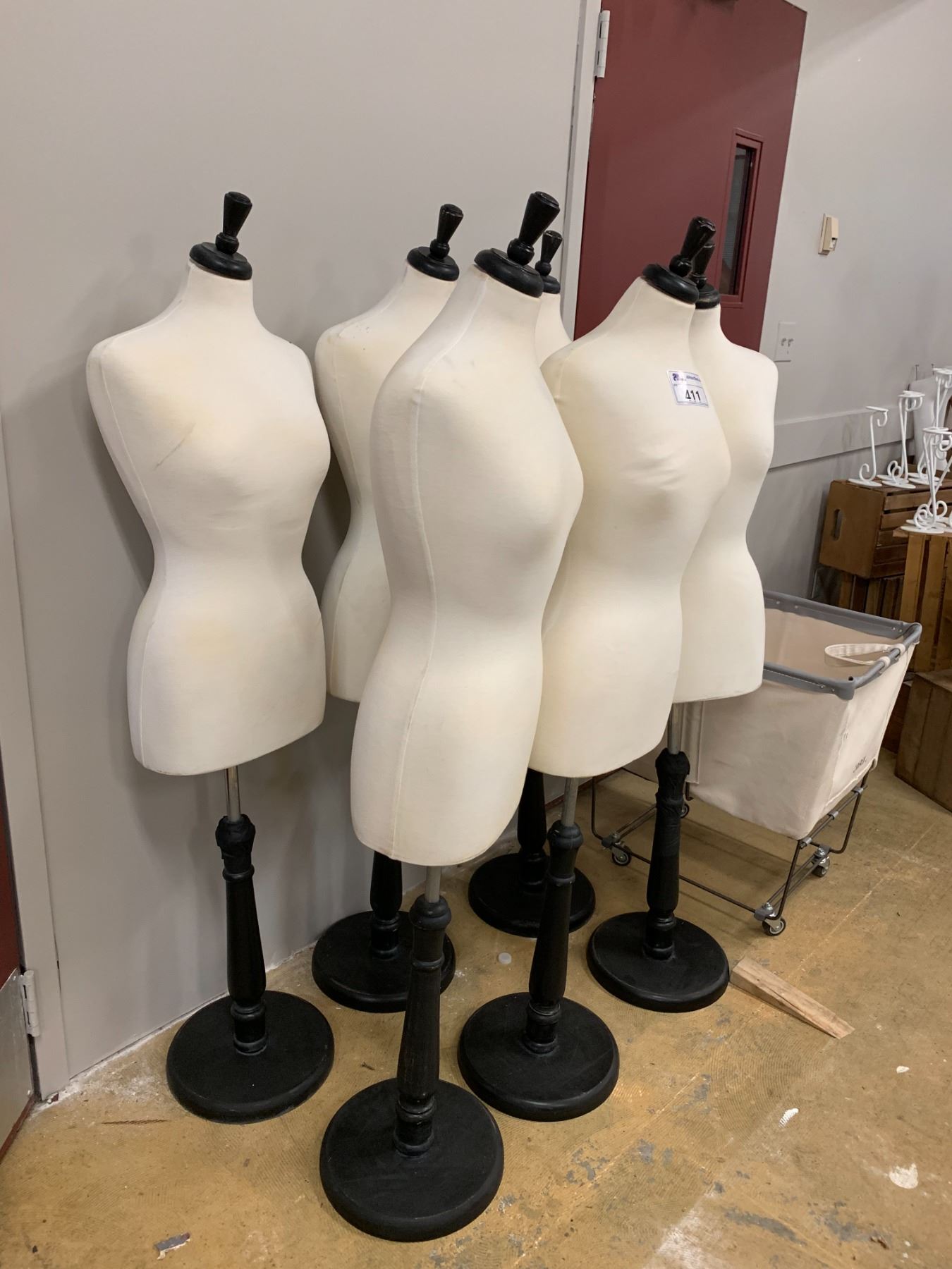 6 TAILORING MANNEQUINS ON STANDS APPROX 58"& FABRIC ROLLING BIN