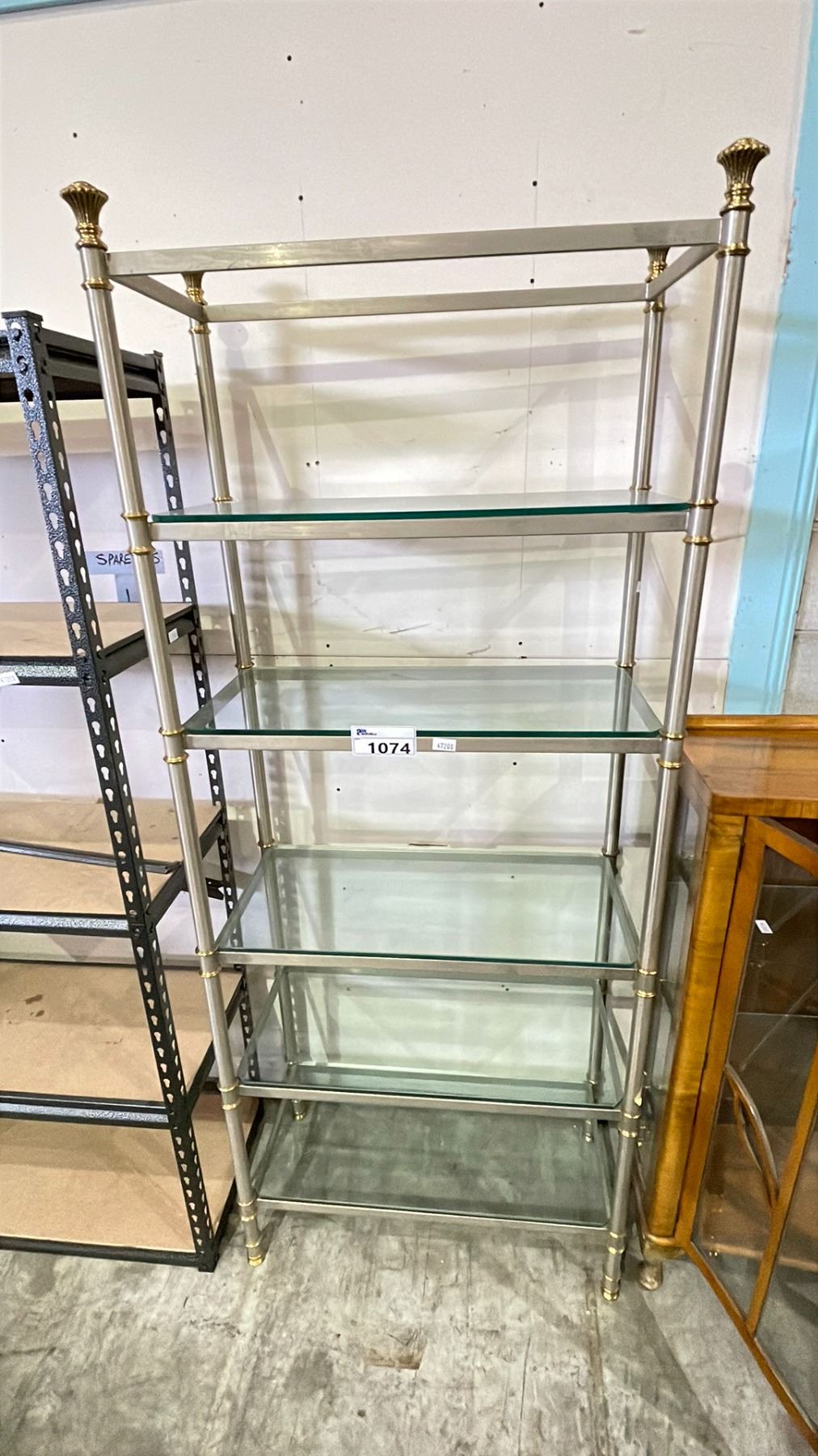 6-TIER METAL SHELVING UNIT WITH GLASS SHELVES 31" X 15" X 77" (1 SHELF MISSING)