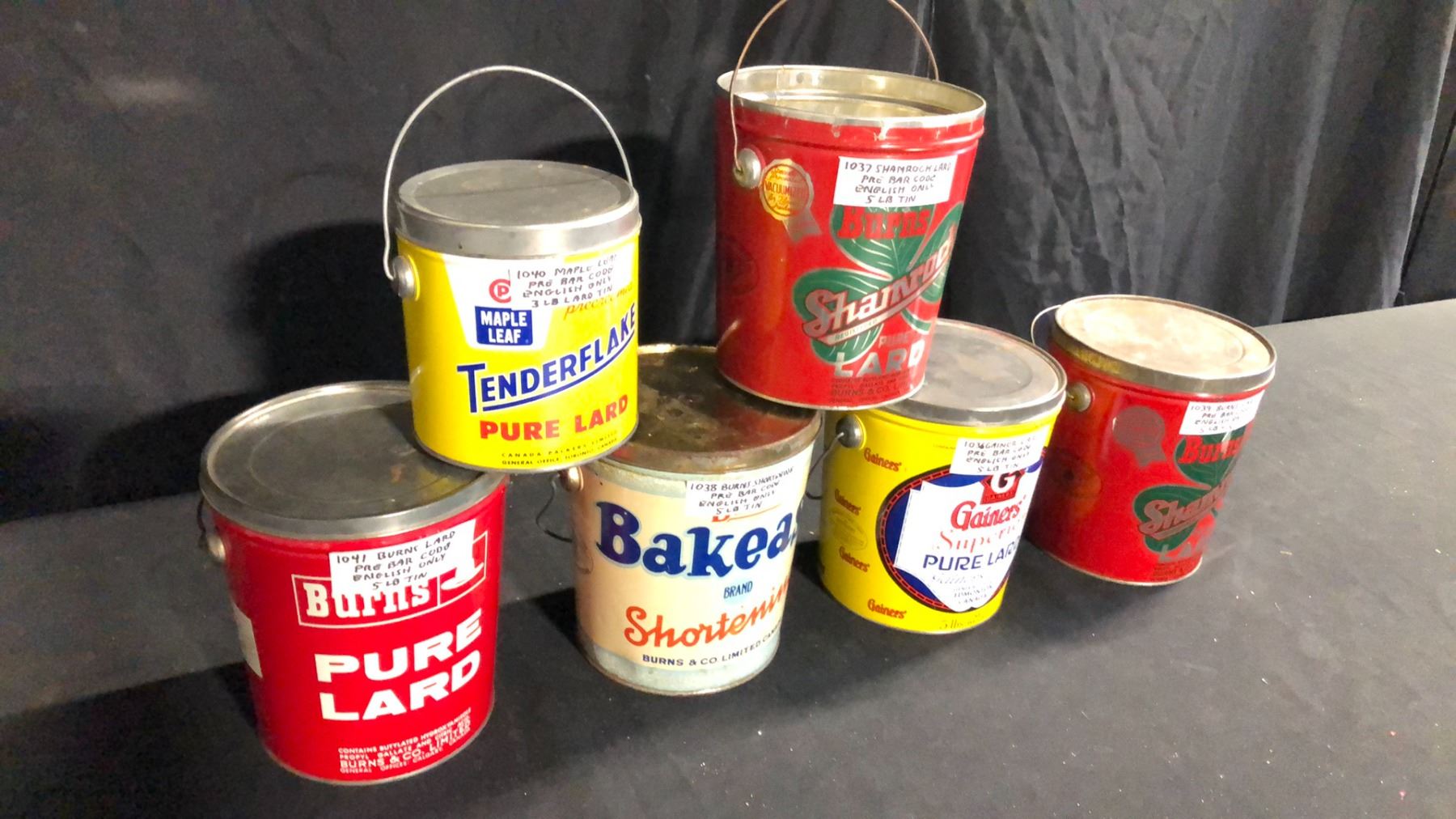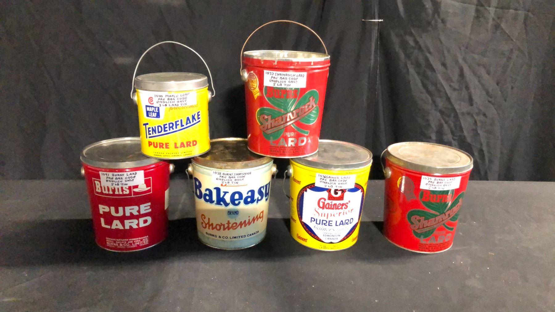 6 VINTAGE LARD AND SHORTENING 5 AND 3 POUND TINS (ASSORTED ENGLISH ONLY, PRE BARCODE)