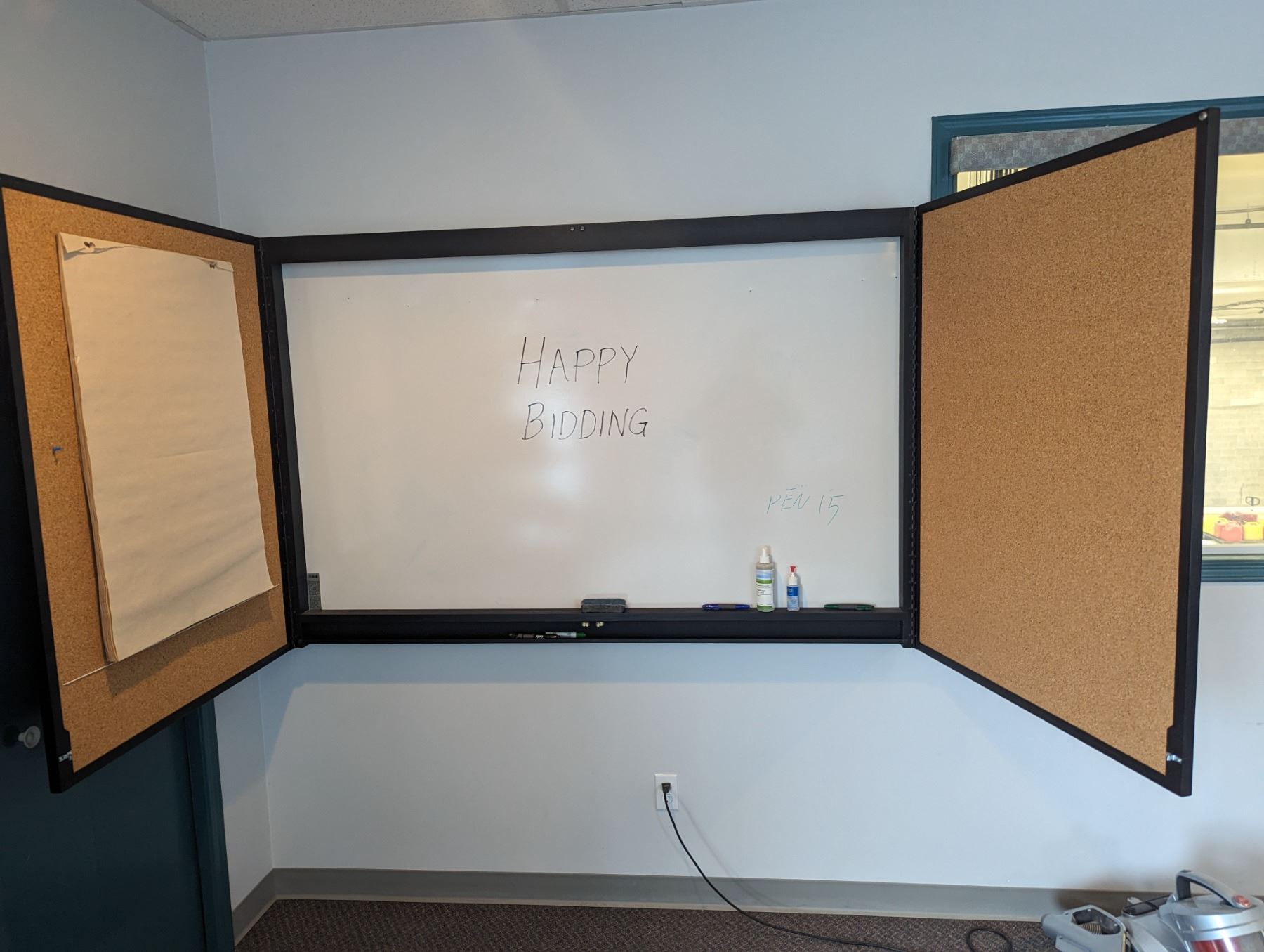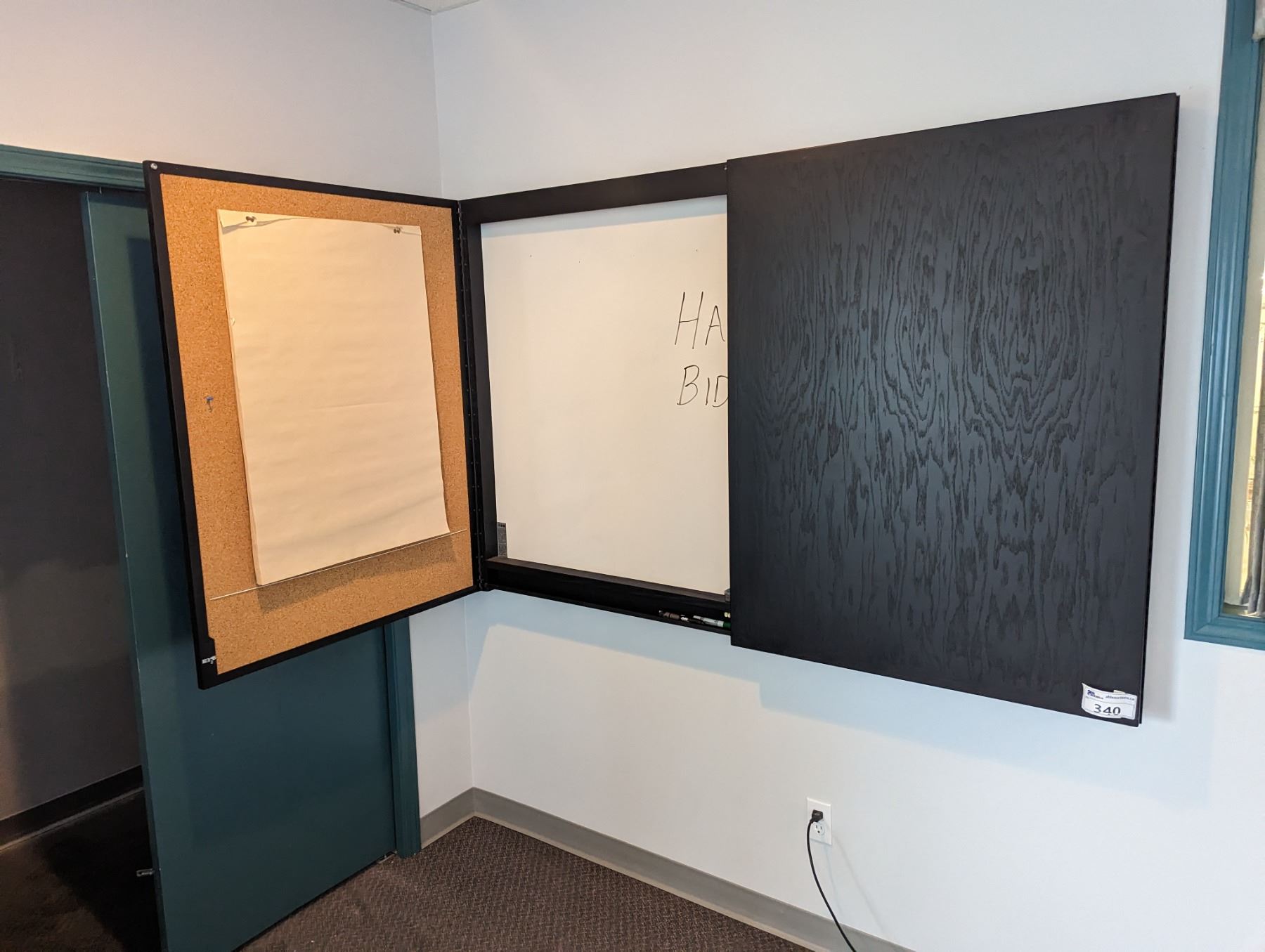 6'X4' WHITEBOARD WITH STAINED OAK DOUBLE DOORS (THEY HAVE CORK BOARD INSIDE).