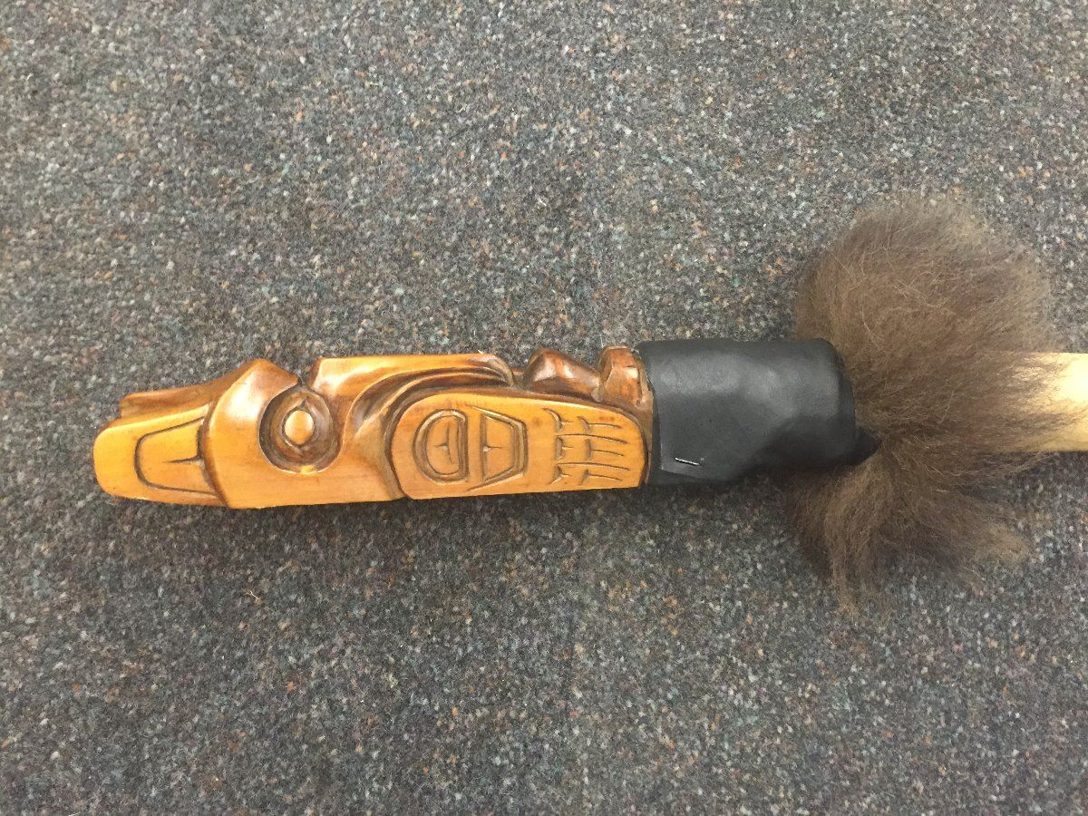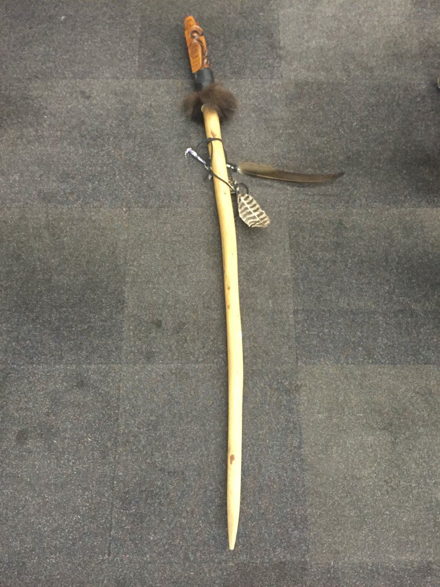 61" TALKING STICK, WITH FEATHERS AND BEADWORK, ARTIST UNKNOWN