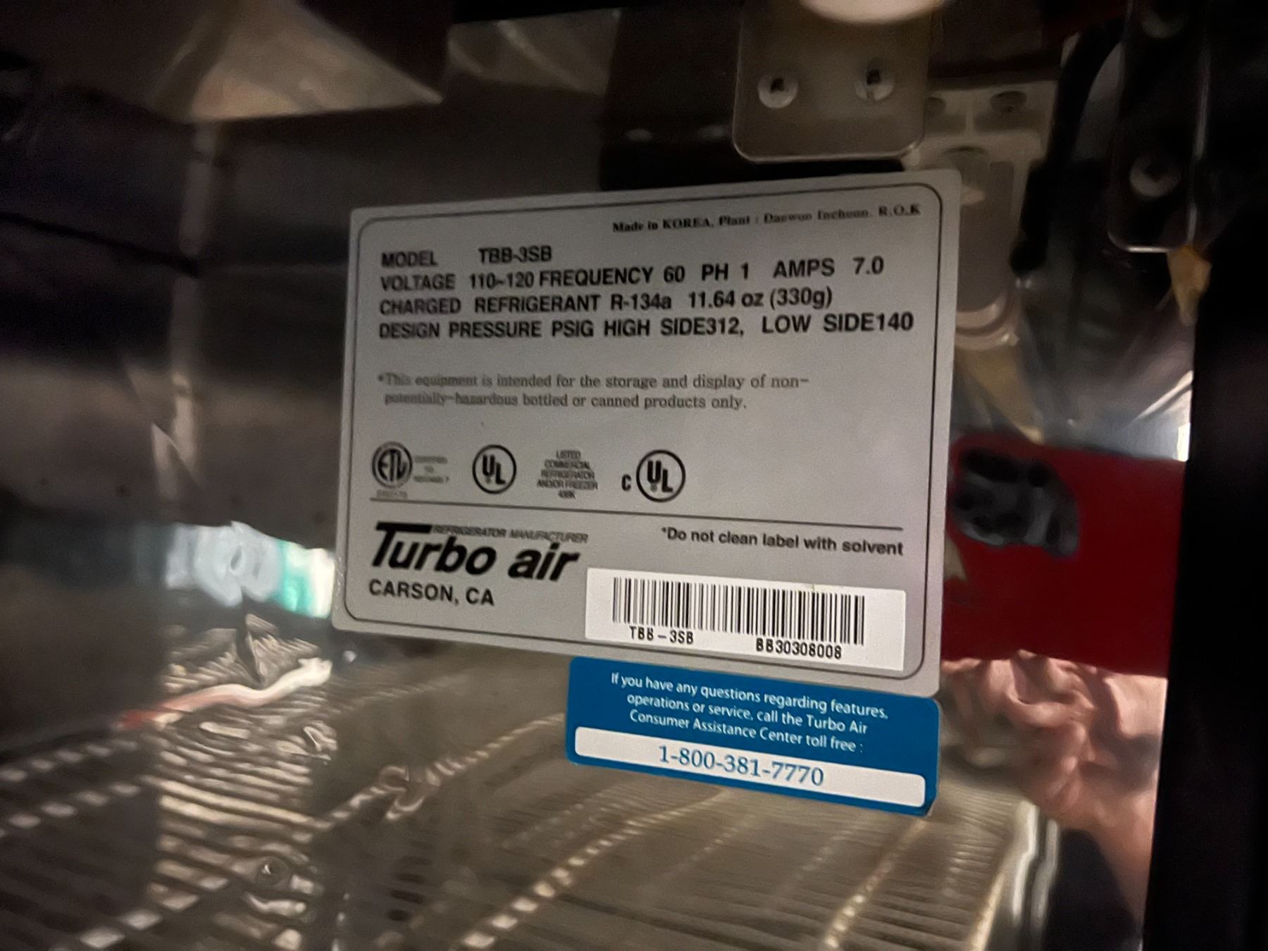 69" LONG TURBO AIR WHEELED 2 DOOR FRIDGE WITH STAINLESS TOP MODEL TBB-3SB 110 VOLT