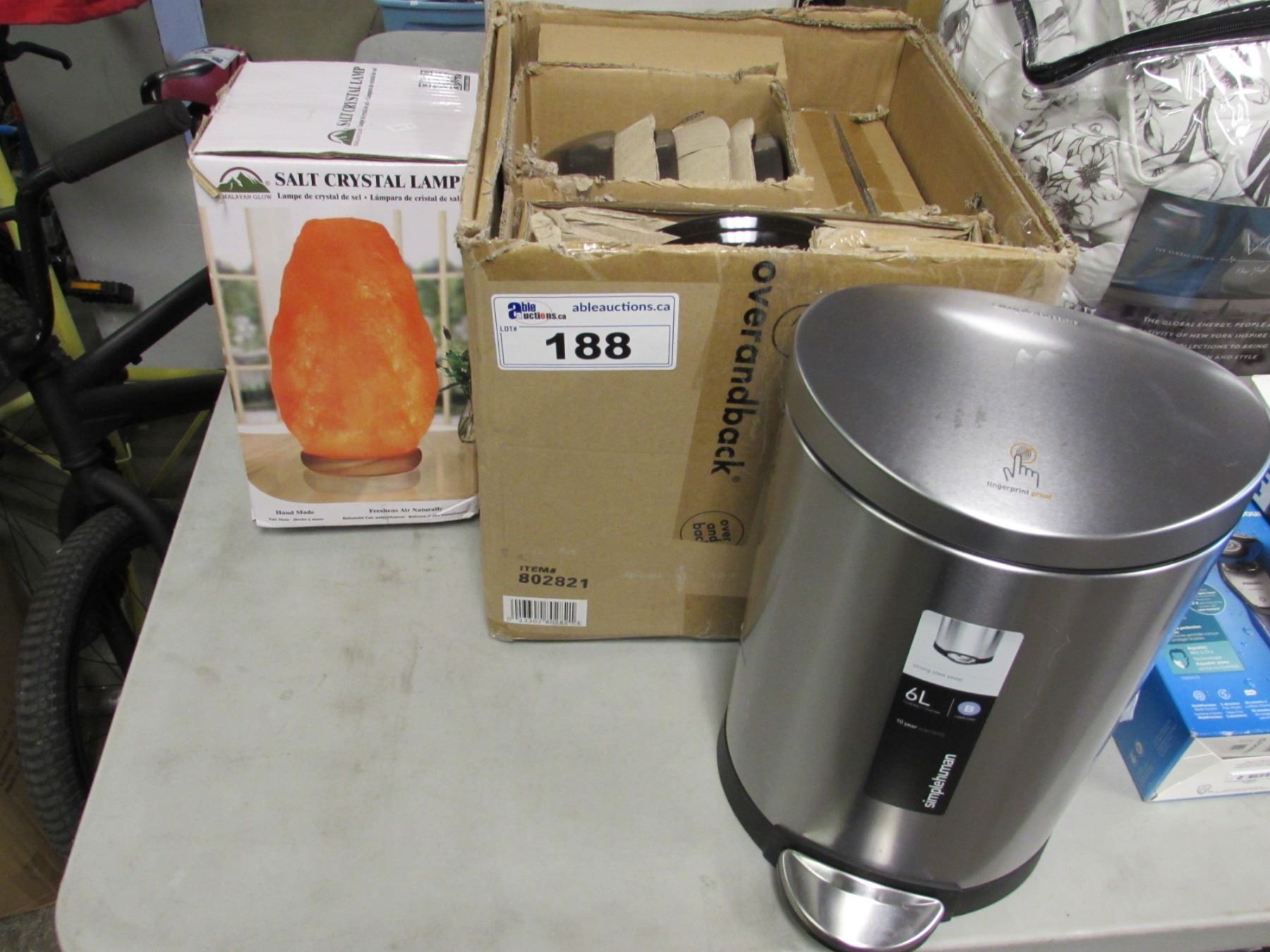 6L SIMPLEHUMAN STEP CAN, CRYSTAL SALT LAMP, DINNERWARE SET