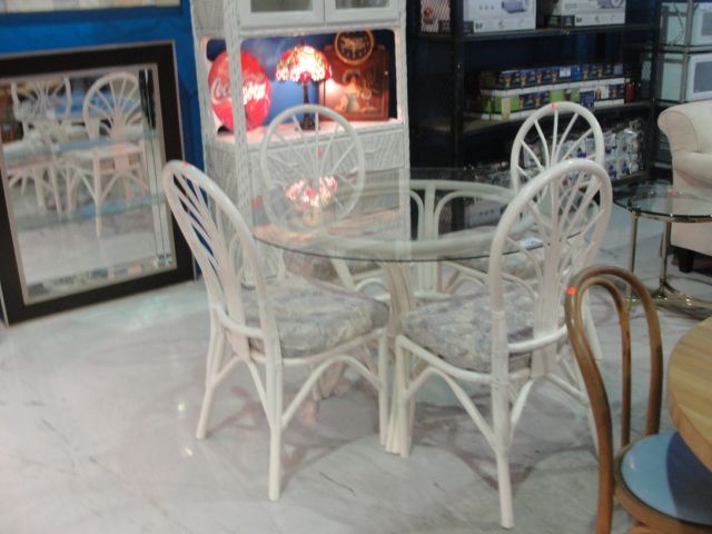 6PC WHITE WICKER RATTAN DINETTE SET; GLASS TOP TABLE WITH 4 CHAIRS AND MATCHING CHINA CABINET