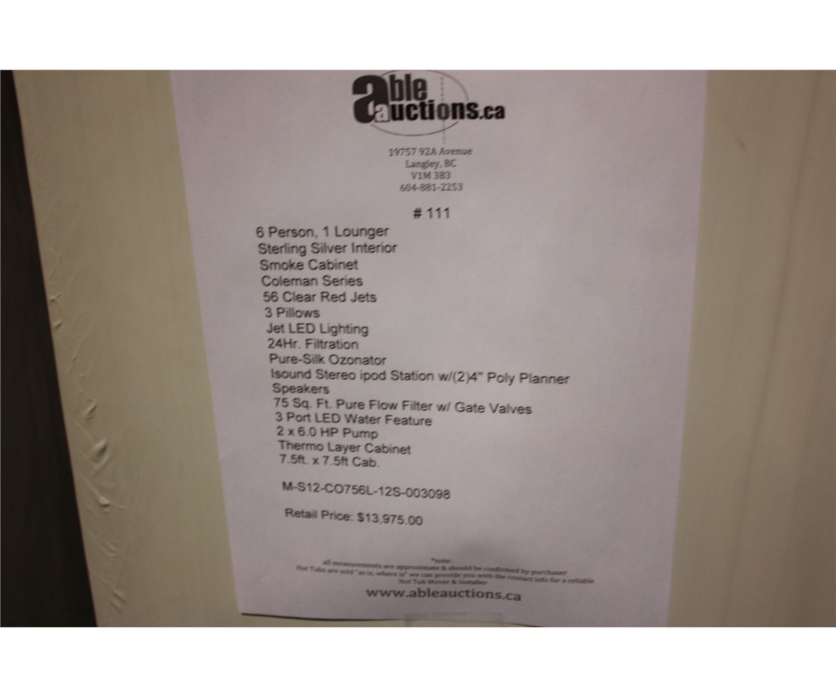 6PERSON, 1 LOUNGER, STERLING SILVER, SMOKE CABINET, 56 CLEAR RED JETS, 3 PILLOWS, LED JET LIGHTING, OZONATOR, 24HR FILTRATION, ISOUND IPOD STEREO W/2 4" SPEAKERS, 2X6HP PUMPS, THERMO LAYER CABINET 7.5FTX7.5FT M-S12-CO756L-12S-003