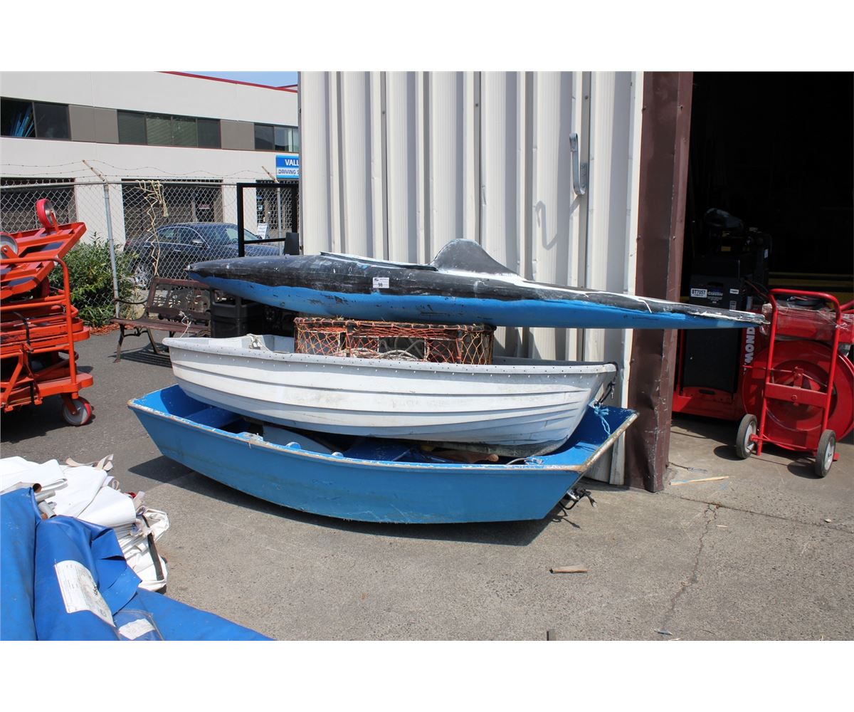 7'10" WOODEN ROW BOAT, 7' FIBERGLASS ROW BOAT, SINGLE PERSON KAYAK AND CRAB TRAP
