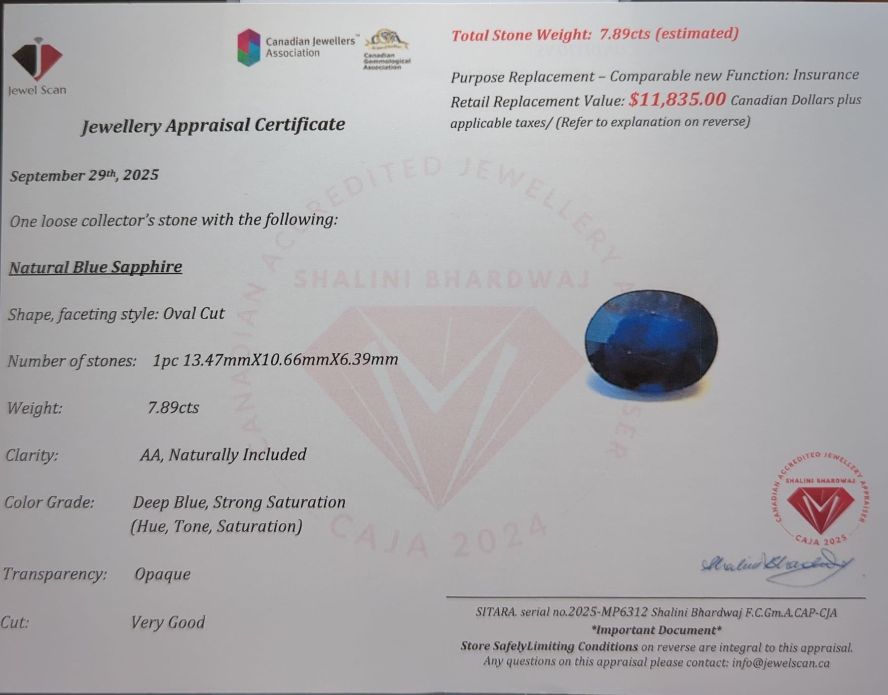 7.89 CT CERTIFIED MIDNIGHT SAPPHIRE GEMSTONE ($11,835 APPRAISAL, APPRAISAL NOT GUARANTEED)