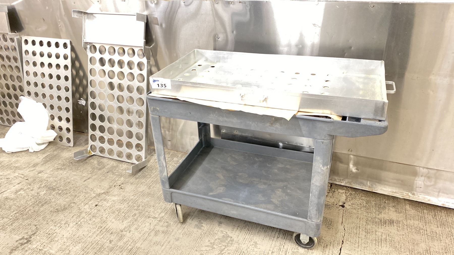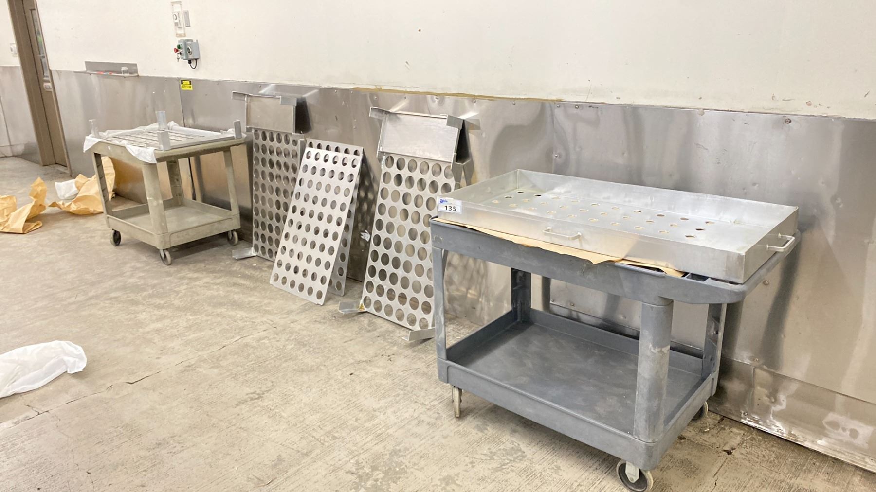 7 ALUMINUM CUSTOM BOTTLE FILLING TRAYS-COMES WITH 2 RUBBERMAID CARTS. VARIOUS SIZES