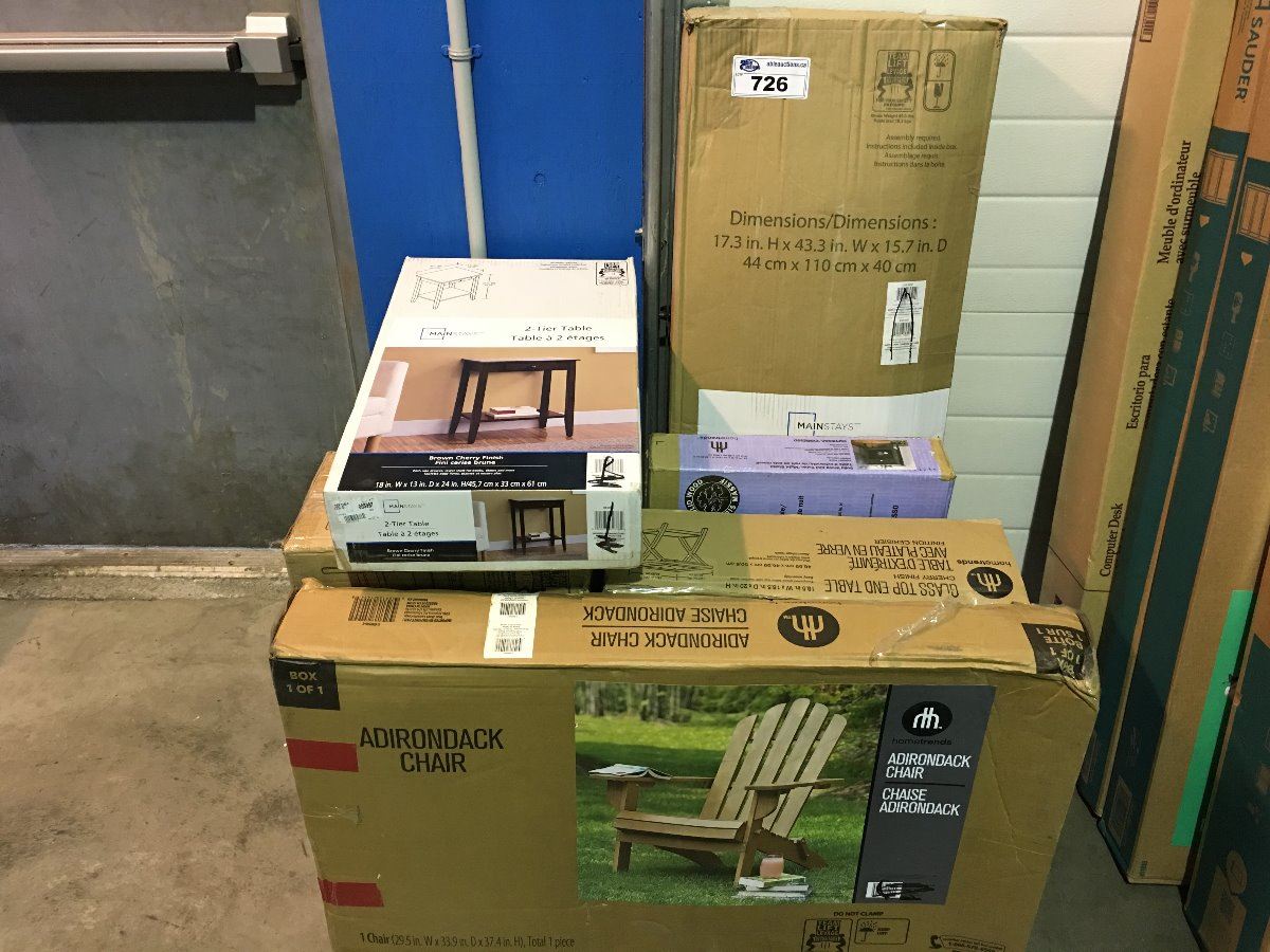 7 ASSORTED BOXED FURNITURE ITEMS - 2 TIER TABLE, COUNTER HIEGHT BAR STOOLS, ADIRONDACK CHAIR ETC.