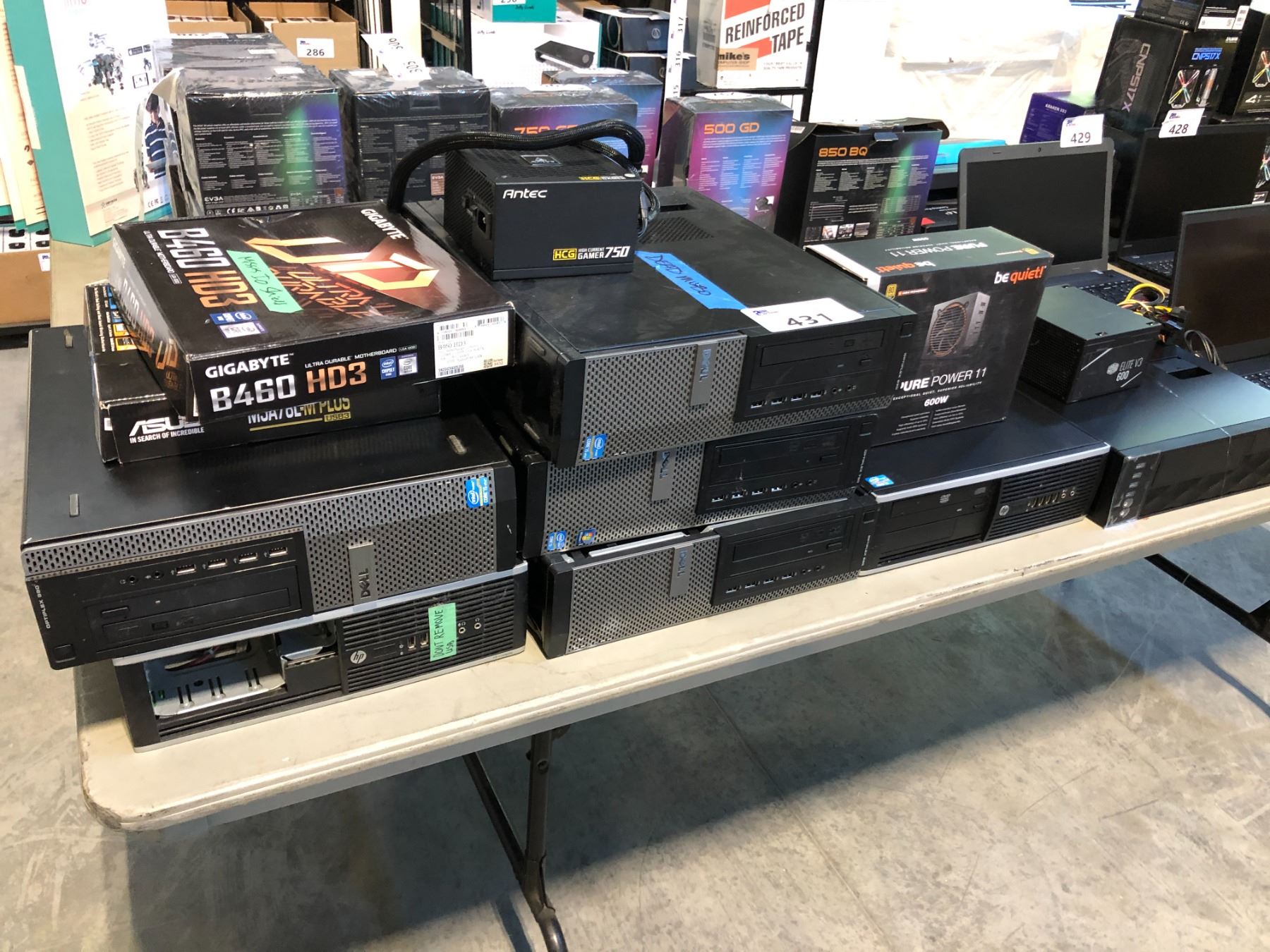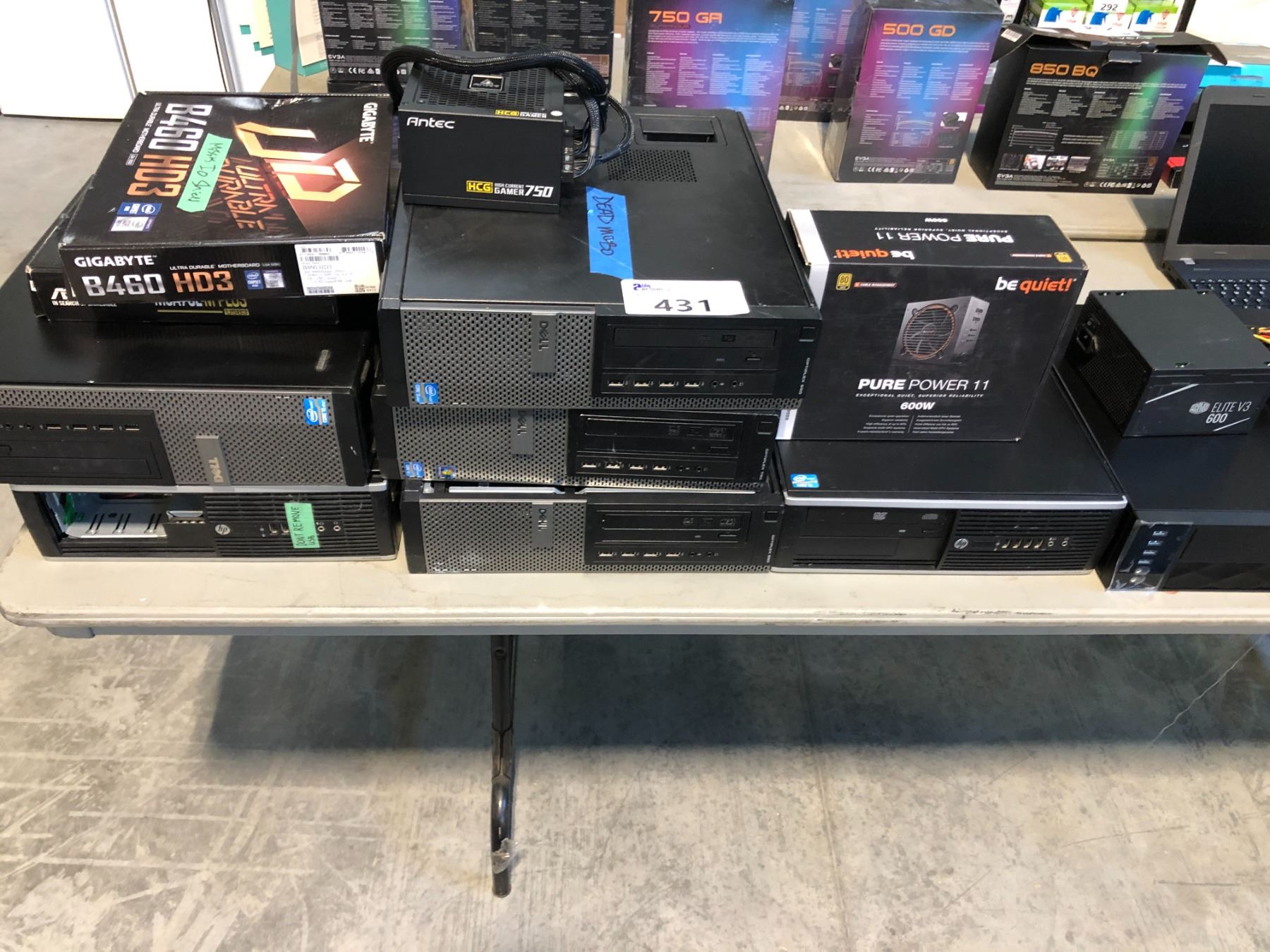 7 ASSORTED DESKTOP COMPUTERS, 4 WITH CORE I5 PROCESSORS, COOL MASTER ELITE V3 600 POWER SUPPLY, BE QUIET! PURE POWER 11 600 WATT POWER SUPPLY, ANTEC 750 HIGH CURRENT GAMER POWER SUPPLY, ASUS M5A78L-M PLUS USB3 CARD, & GIGABYTE B460 HD3 MOTHERBOARD ( MISSING SHIELD ON MOTHERBOARD, NO HARD DRIVES IN TOWERS )