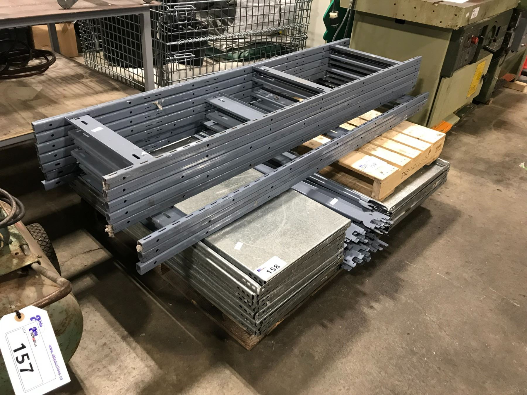 7 BAYS OF ASSORTED SIZED COMMERCIAL STORAGE SHELVING INCLUDING 8 UP RIGHTS, APPROX 24 GAL SHELVES AND CROSS BEAMS.