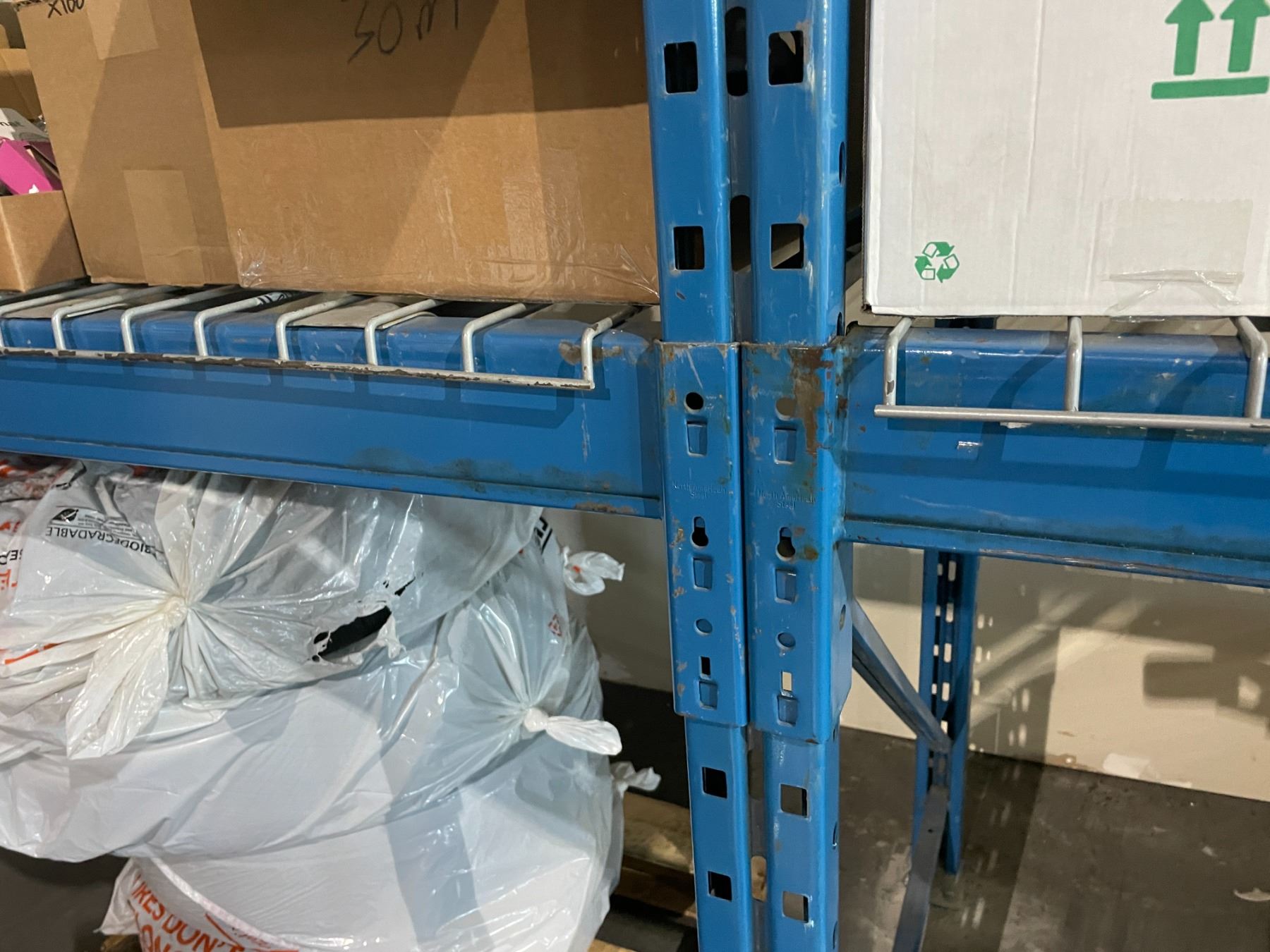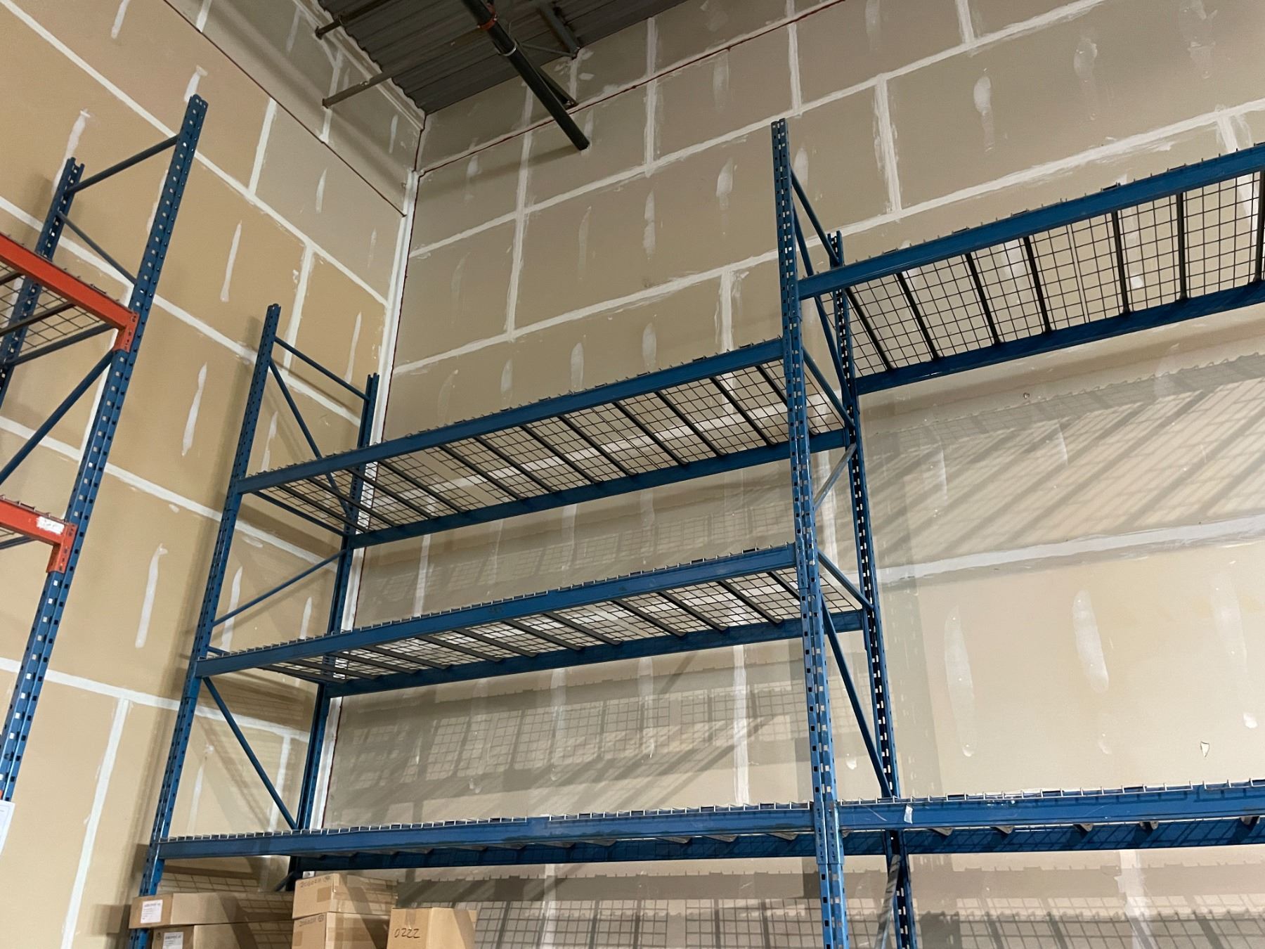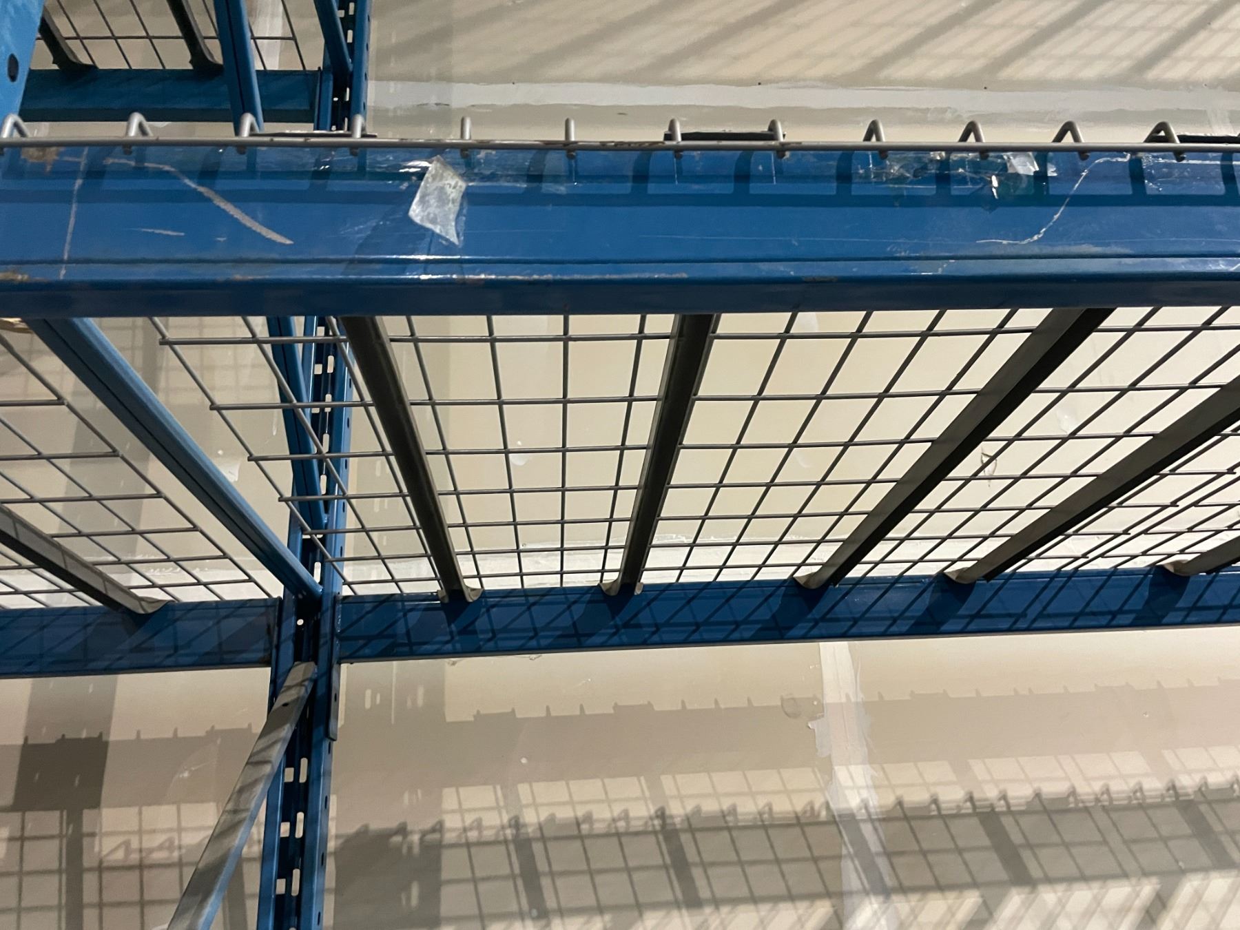 ** 7 BAYS OF BLUE 19' TALL 12' CROSSBAR 42" DEPTH ADJUSTABLE INDUSTRIAL PALLET RACKING WITH MESH DECKING & ASSORTED 12' CROSSBARS LOCATED IN CORNER OF BUILDING *REQUIRES TOOLS AND LADDERS FOR REMOVAL AND HELP - MUST BE DISASSEMBLED*