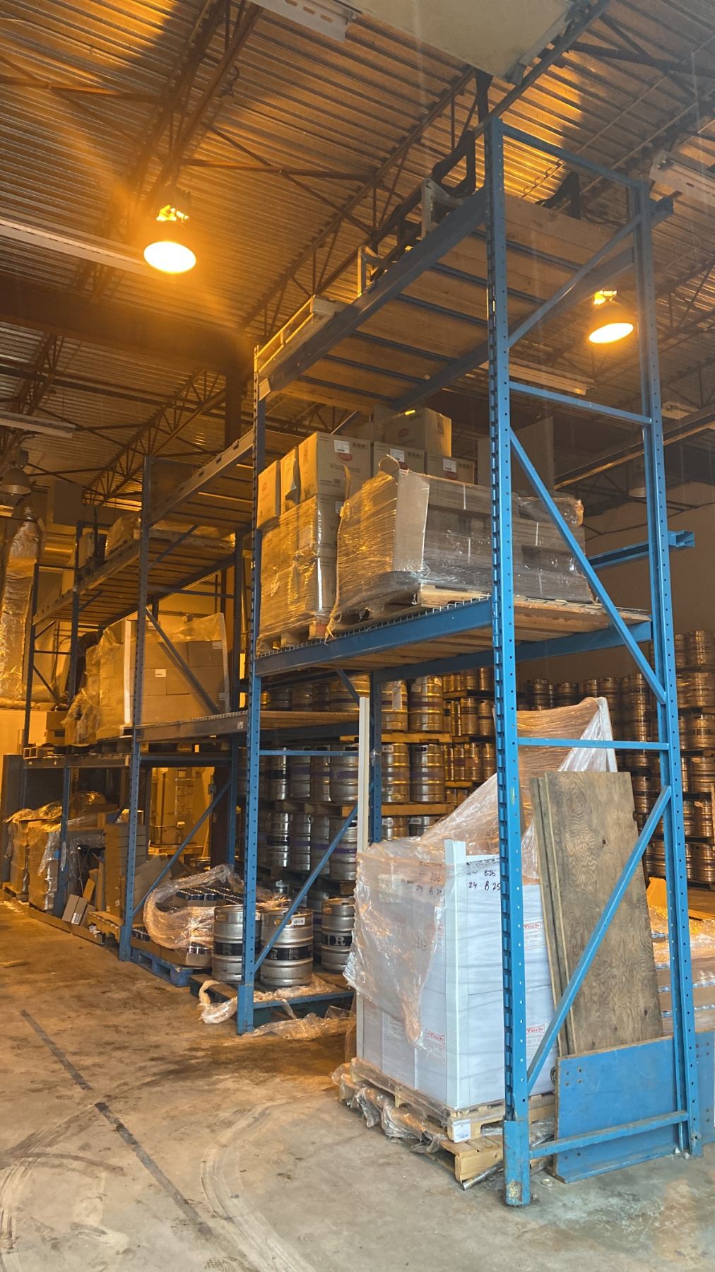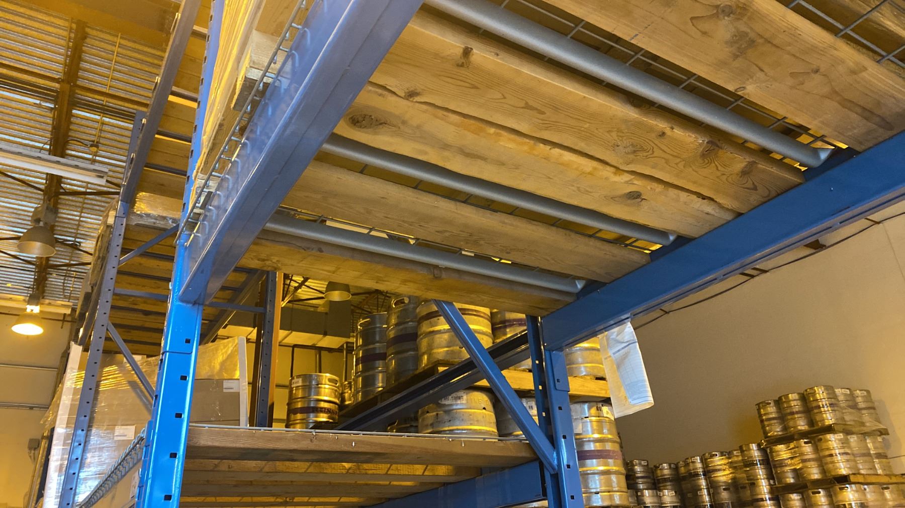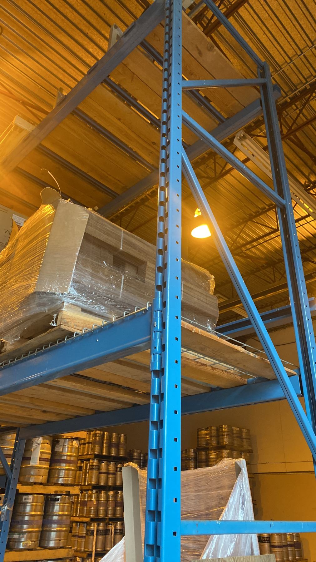 7 BAYS OF BLUE PALLET RACKING - (9) 16FT UPRIGHTS, (24) 9FT & (4) 12FT SIDE RAILS WITH MOSTLY WOOD SHELVING AND SOME MESH DECK **BUYER REQUIRES ALL TOOLS, EQUIPMENT AND HELP FOR REMOVAL - MUST BE DISASSEMBLED** **ALL NECESSARY PROTECTIVE GEAR AND FALL GEAR FOR 10FT HEIGHTS AND ABOVE** *LAST DAY PICK UP*