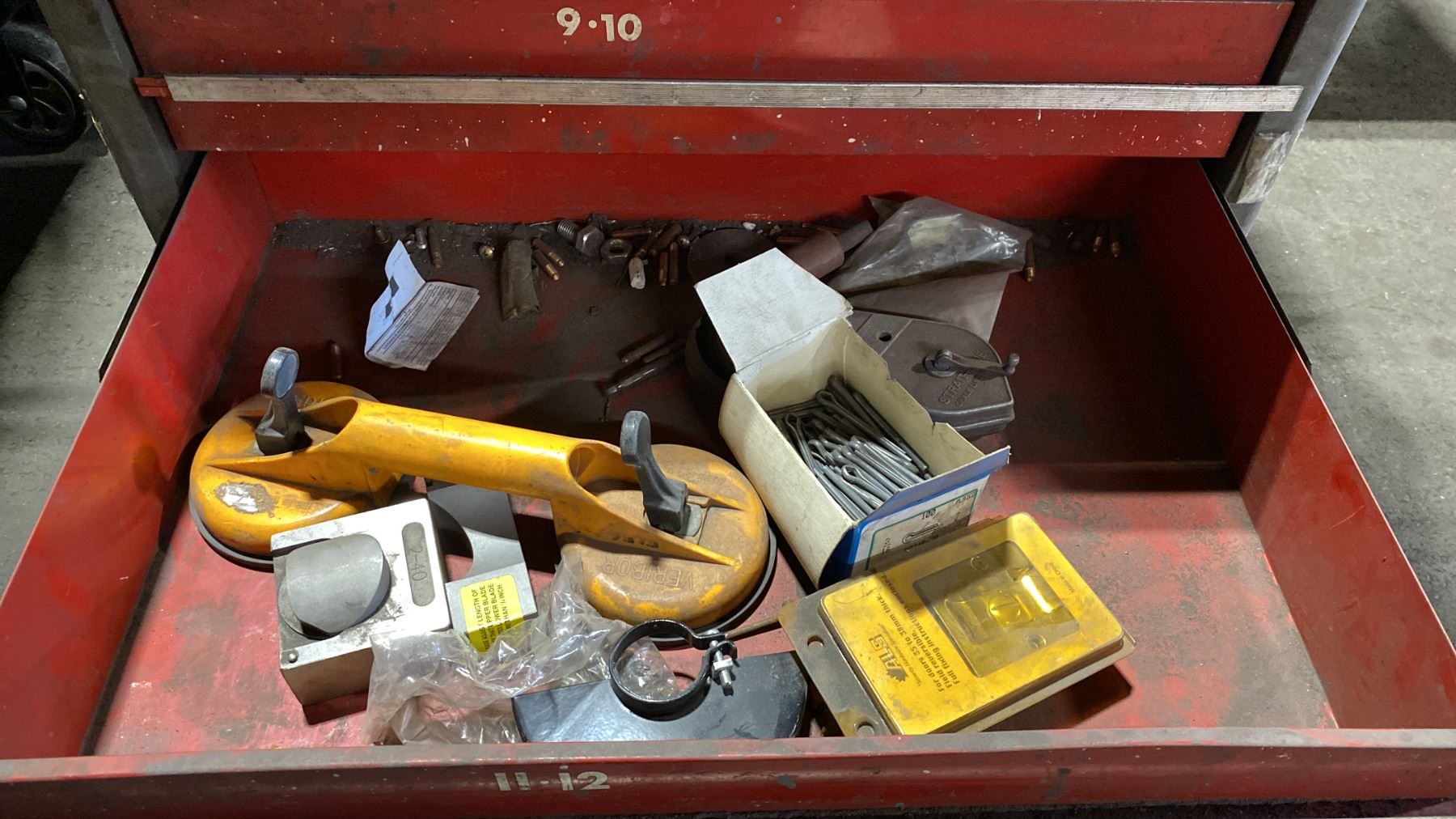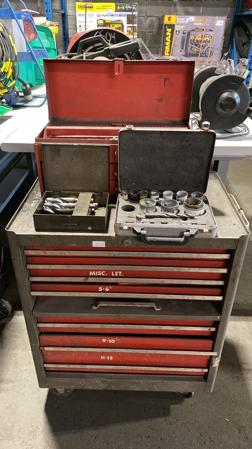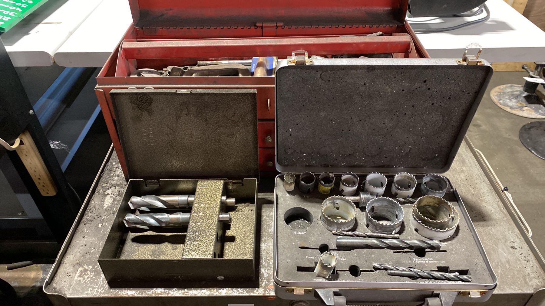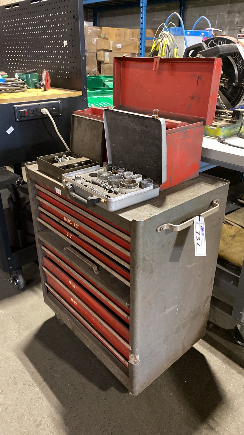 7 DRAWER SMALL MOBILE TOOL CHEST WITH ASSORTED TOOL CONTENTS, RED METAL TOOLBOX WITH ASSORTED TOOLS & 2 TOOL KITS WITH HOLE SAWS & DRILL BITS MOBILE TOOL CHEST MEASURES APPROX 27"W X 19"D X 34"H