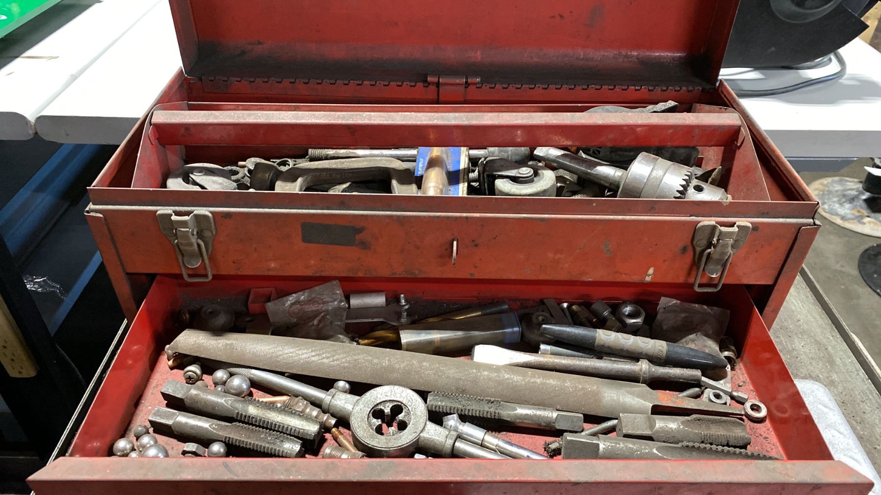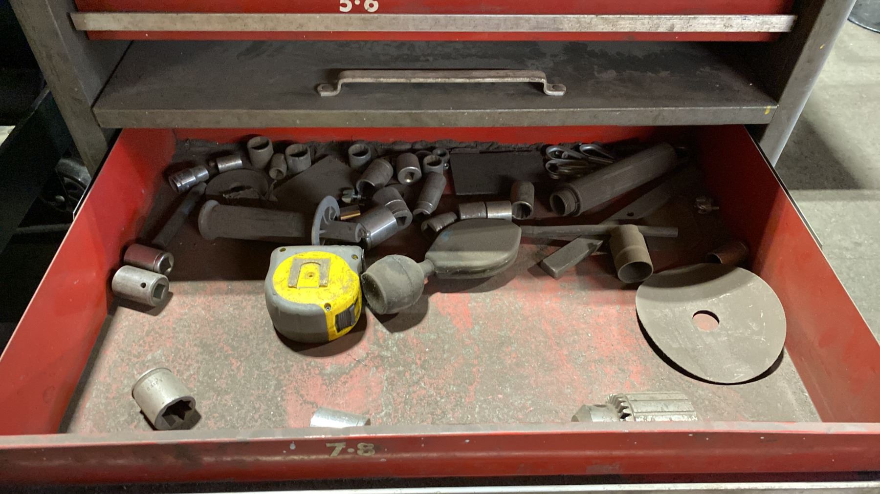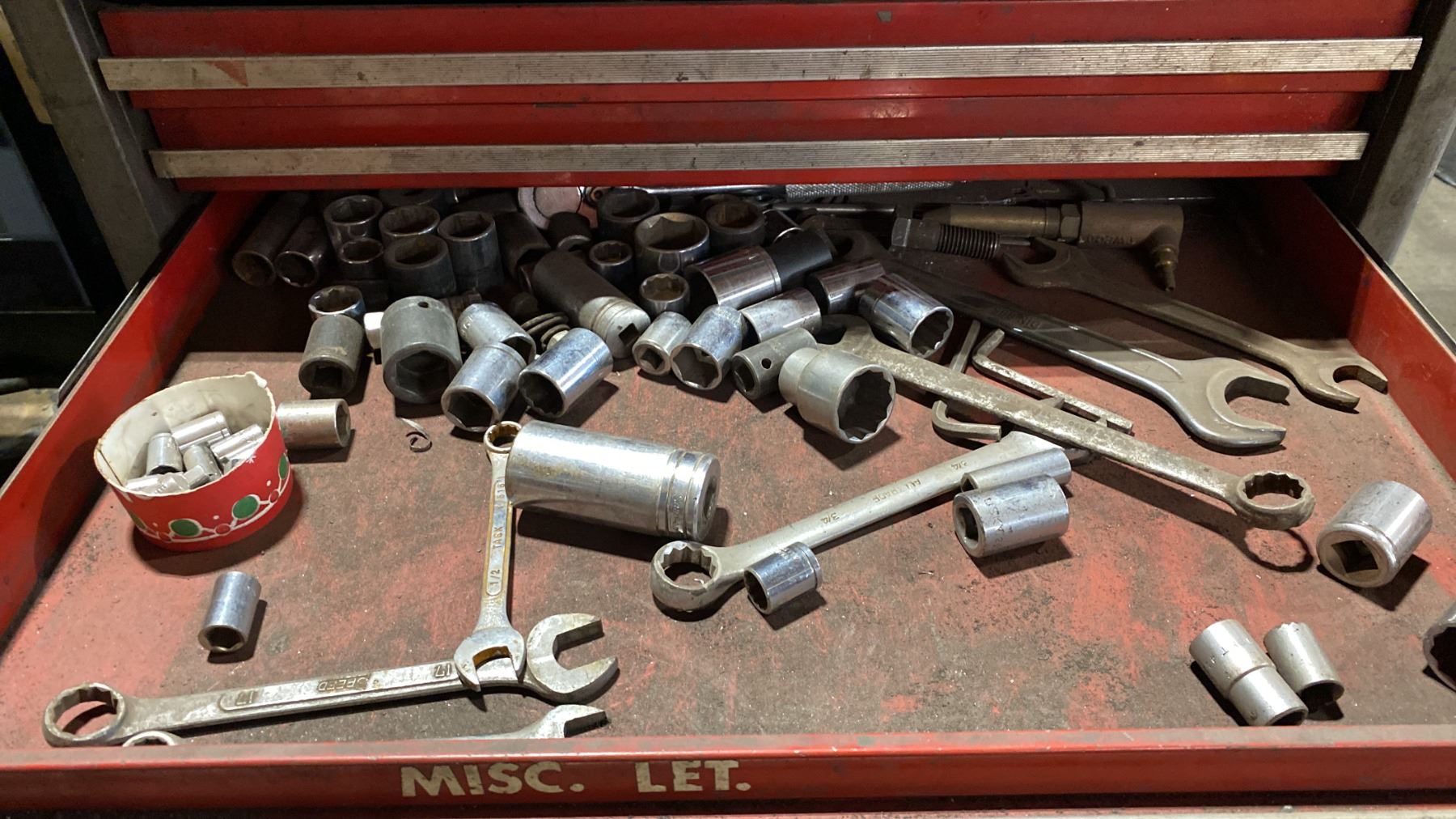7 DRAWER SMALL MOBILE TOOL CHEST WITH ASSORTED TOOL CONTENTS, RED METAL TOOLBOX WITH ASSORTED TOOLS & 2 TOOL KITS WITH HOLE SAWS & DRILL BITS MOBILE TOOL CHEST MEASURES APPROX 27"W X 19"D X 34"H