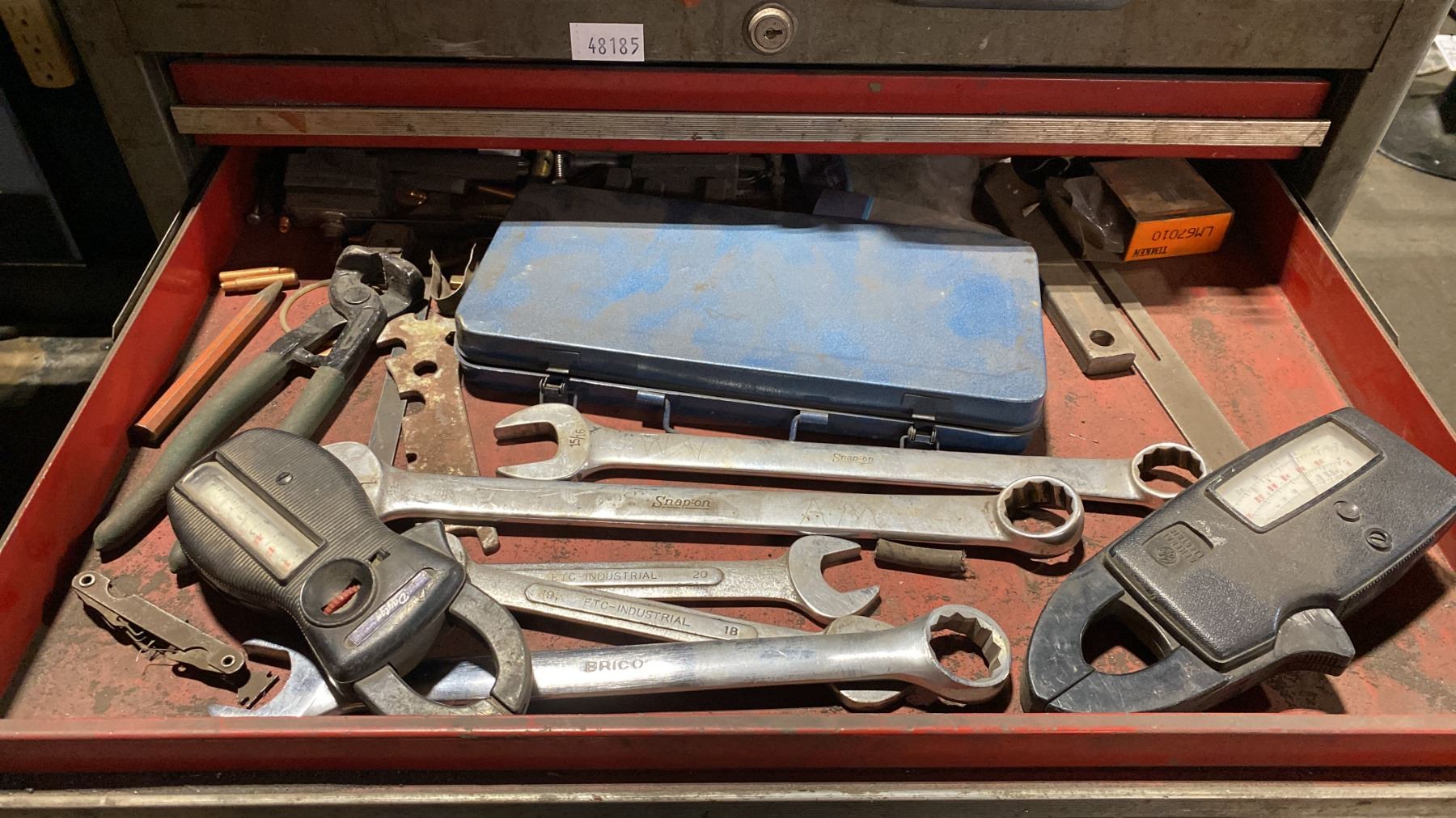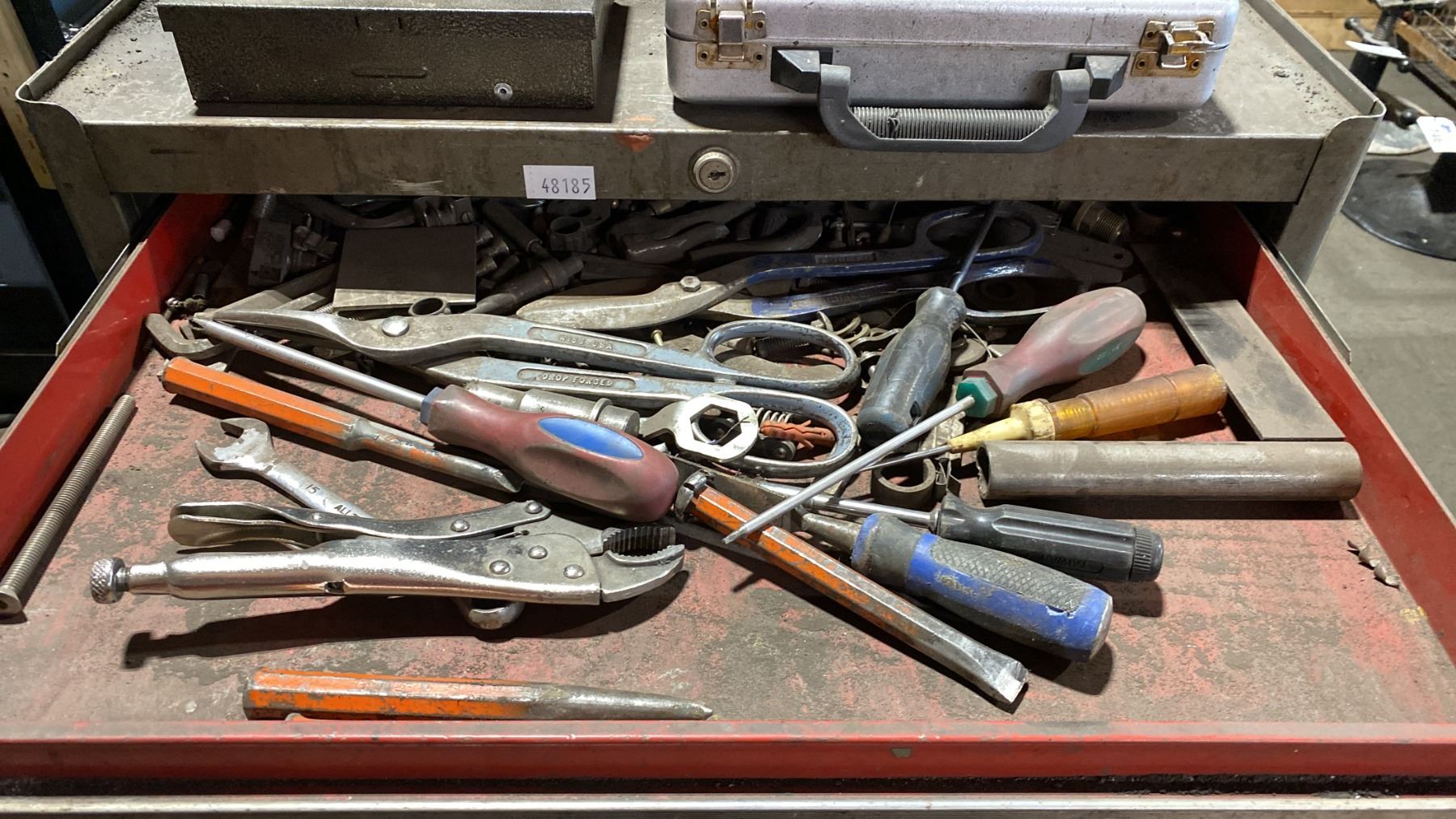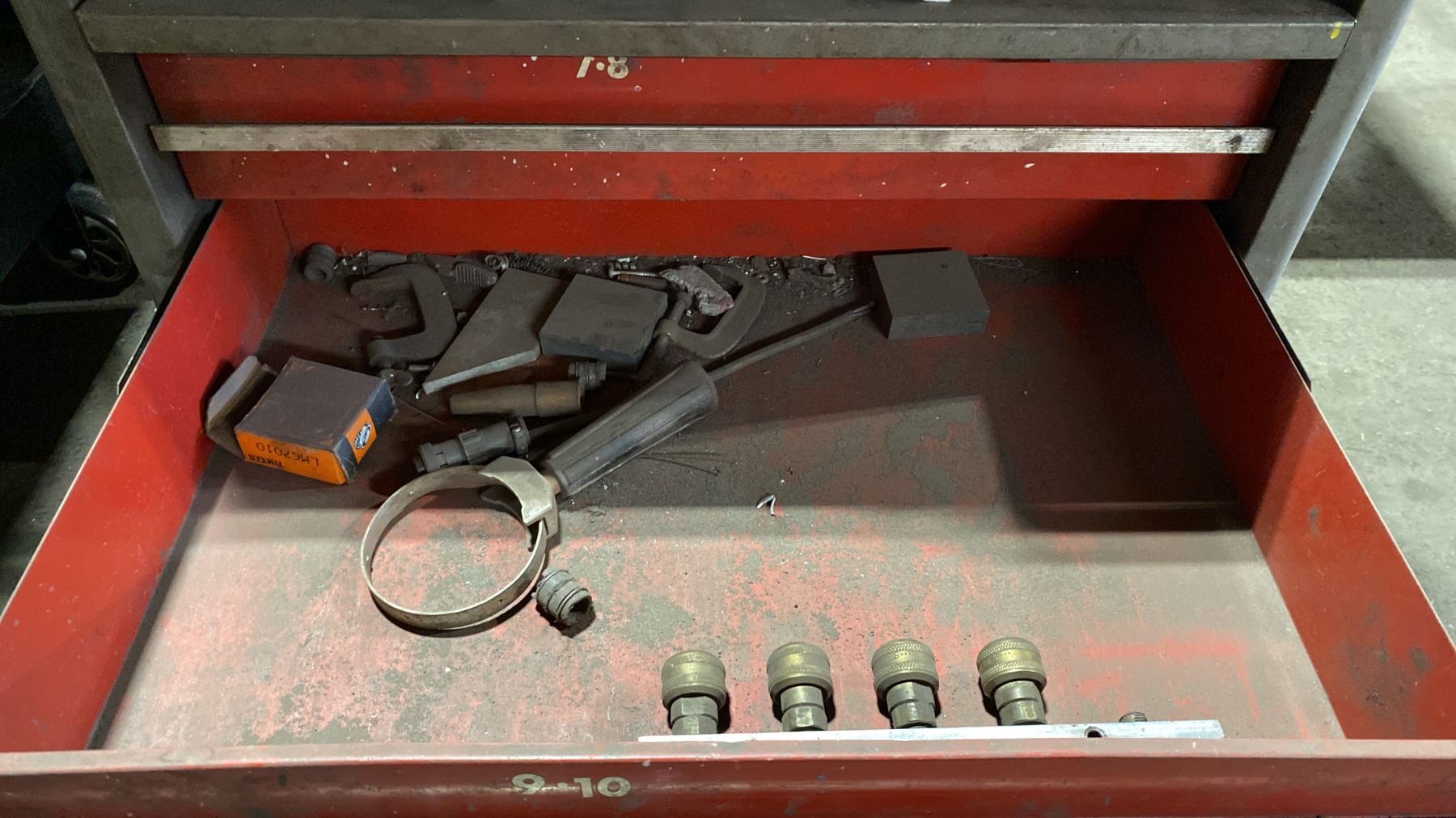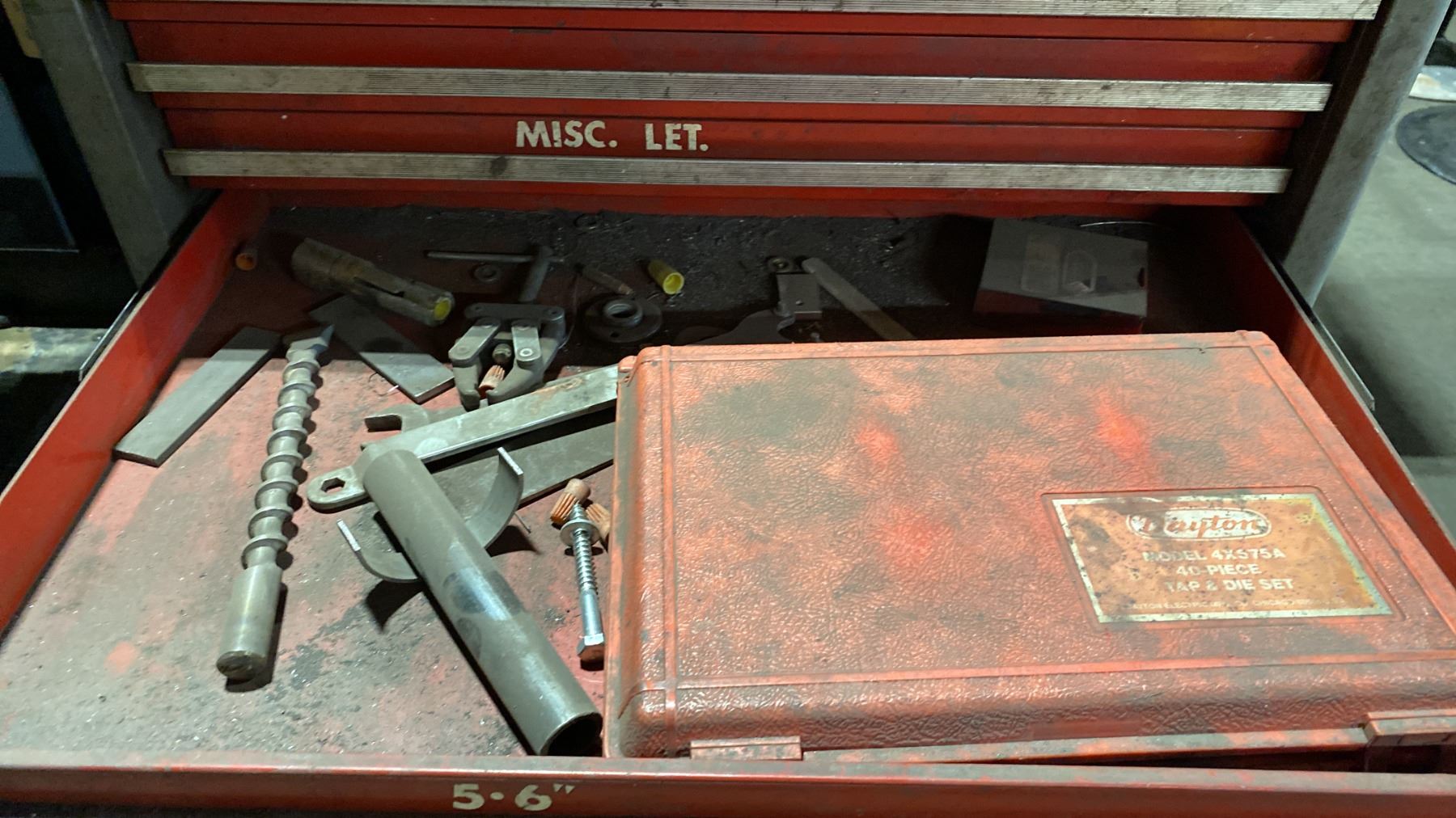7 DRAWER SMALL MOBILE TOOL CHEST WITH ASSORTED TOOL CONTENTS, RED METAL TOOLBOX WITH ASSORTED TOOLS & 2 TOOL KITS WITH HOLE SAWS & DRILL BITS MOBILE TOOL CHEST MEASURES APPROX 27"W X 19"D X 34"H