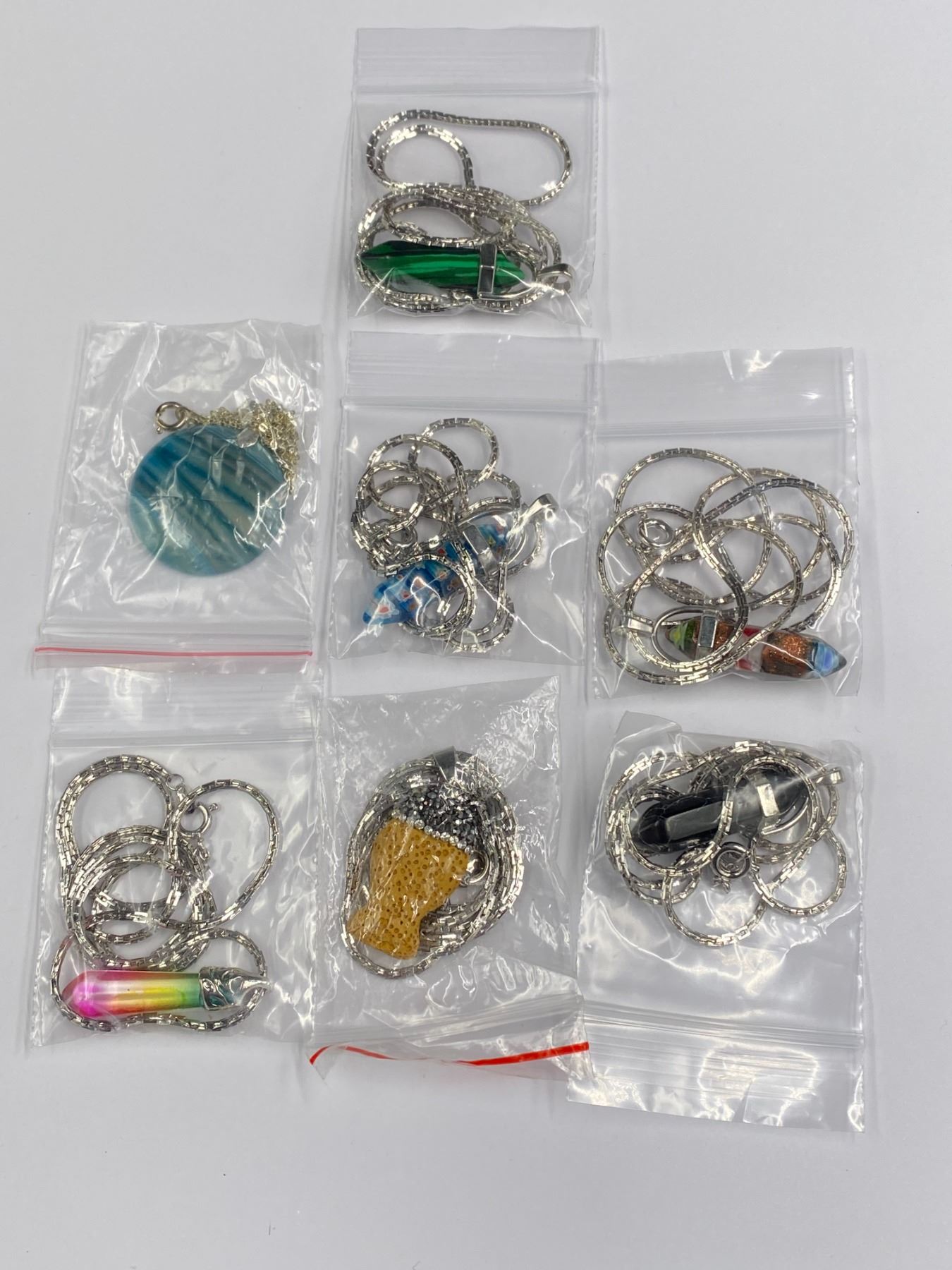 7 GEMSTONE PENDANTS: LAVASTONE, RARE BLUE AGATE, SANDSTONE, TITANIUM AURA, COATED CRYSTAL, MURANO