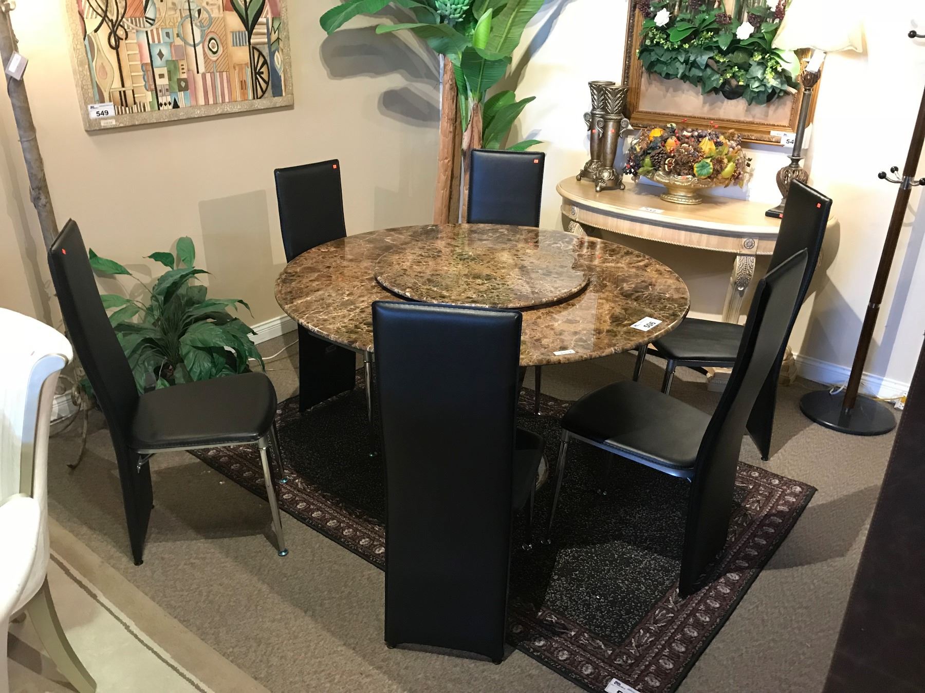 7 PIECE DARK MARBLE LAZY SUSAN DINING TABLE WITH 6 LEATHER CHAIRS RETAIL - $8,000