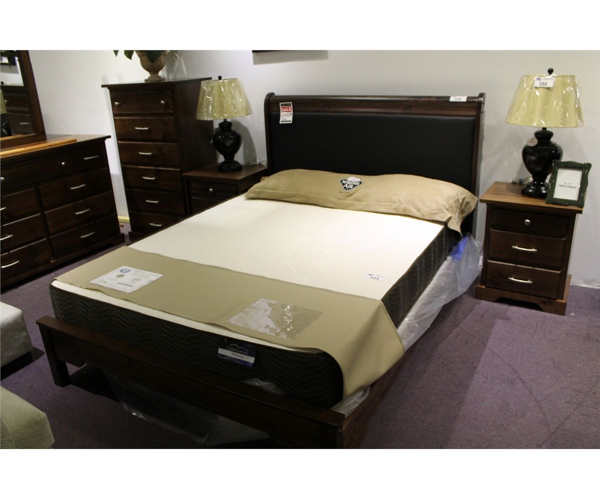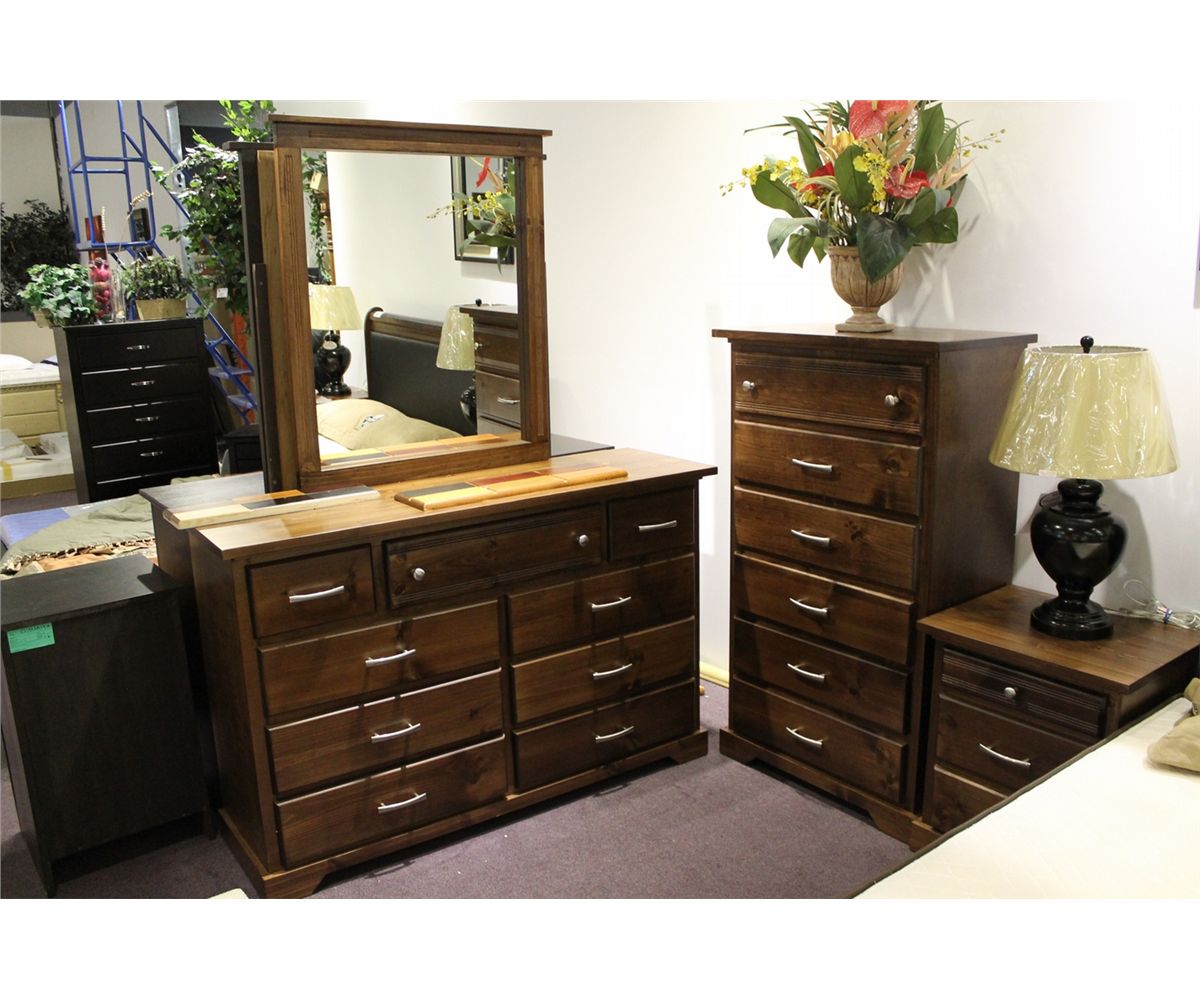 7 PIECE DARK WOOD BEDROOM SET WITH QUEEN SIZE BED, 2 NIGHT STANDS, UPRIGHT DRESSER & HORIZONTAL DRESSER WITH MIRROR