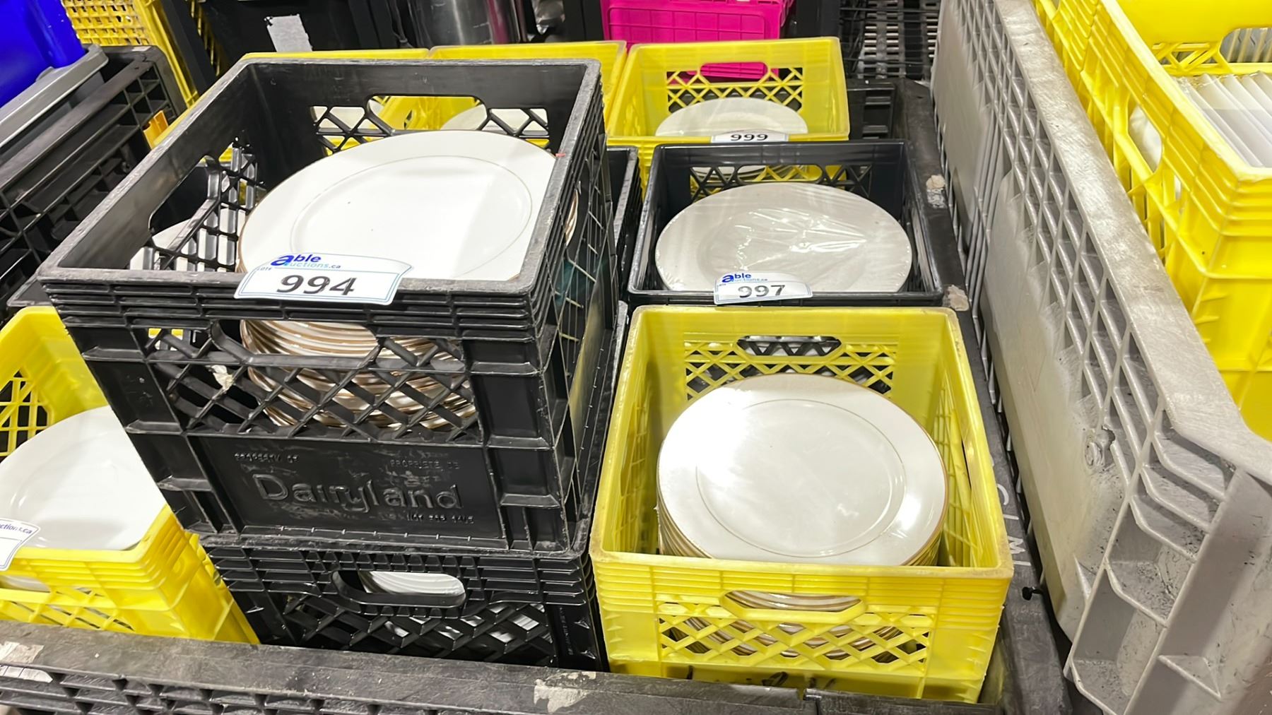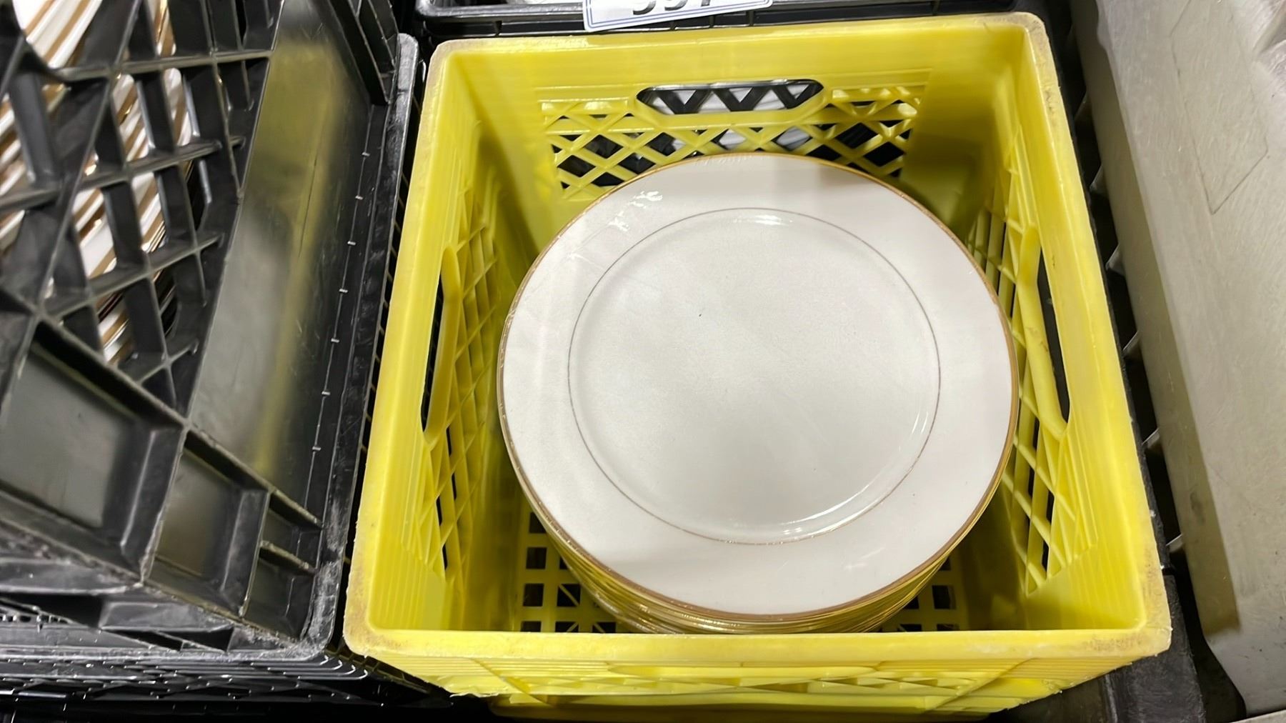 7 PLASTIC CRATES OF 10 1/2" WHITE GOLD RIMMED COMMERCIAL RESTAURANT DINNER PLATES *PLASTIC CRATES INCLUDED* ( APPROX. 20 PLATES PER CRATE )