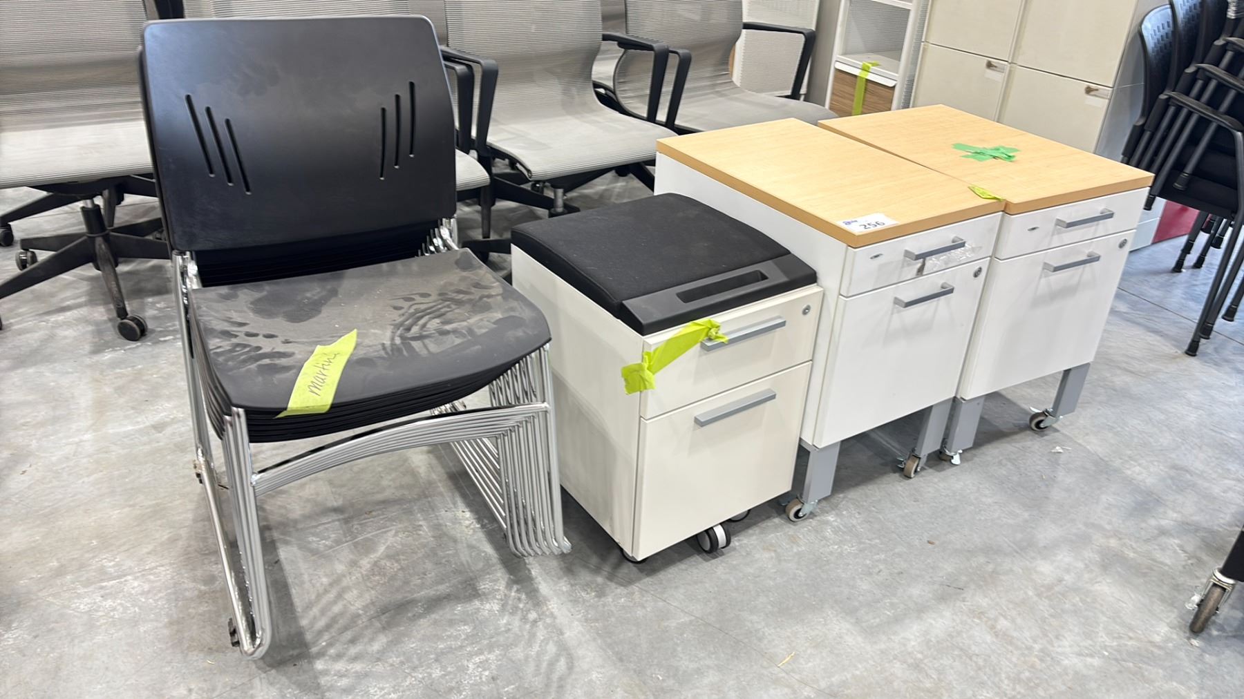 7 STACKING CHAIRS & (3) ASSORTED ROLLING CABINETS