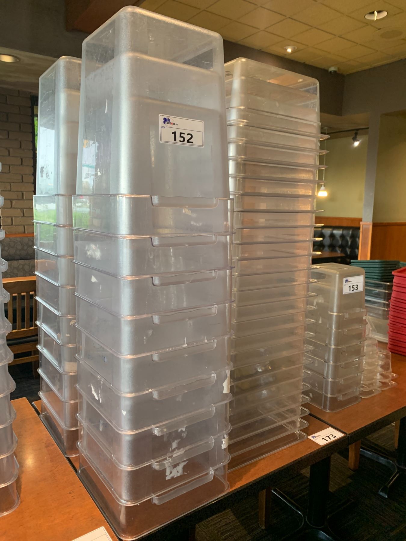 7 STACKS OF ASSORTED TRANSPARENT COMMERCIAL PLASTIC CONTAINERS