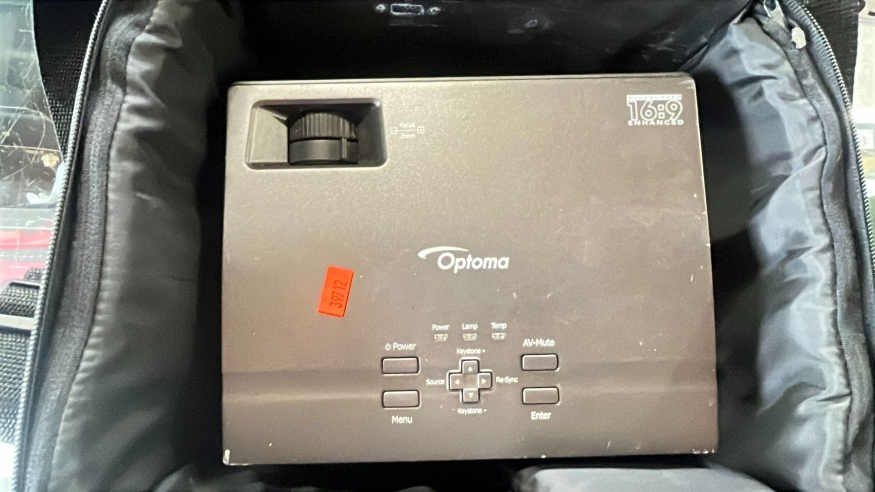 7'W PROJECTOR SCREEN WITH OPTOMA PROJECTOR IN A SOFT TRANSPORT CASE