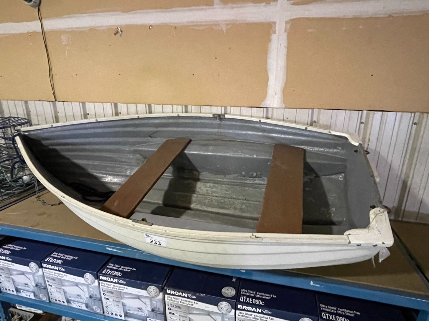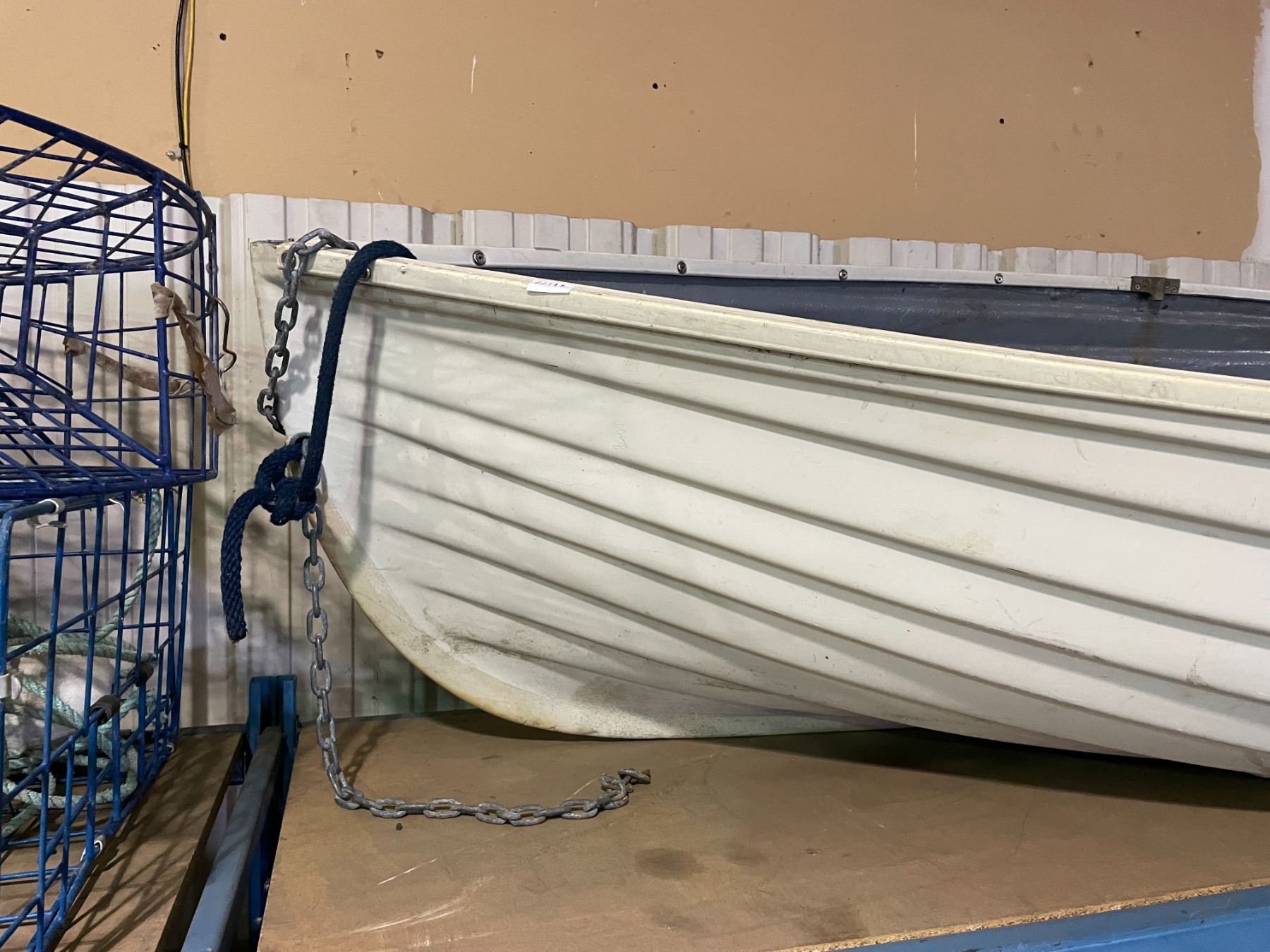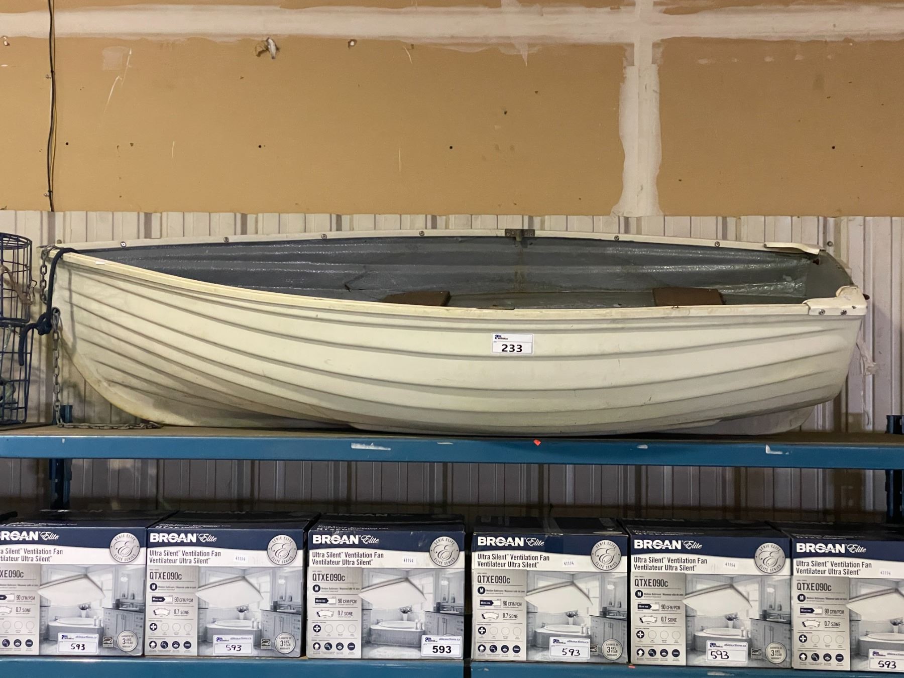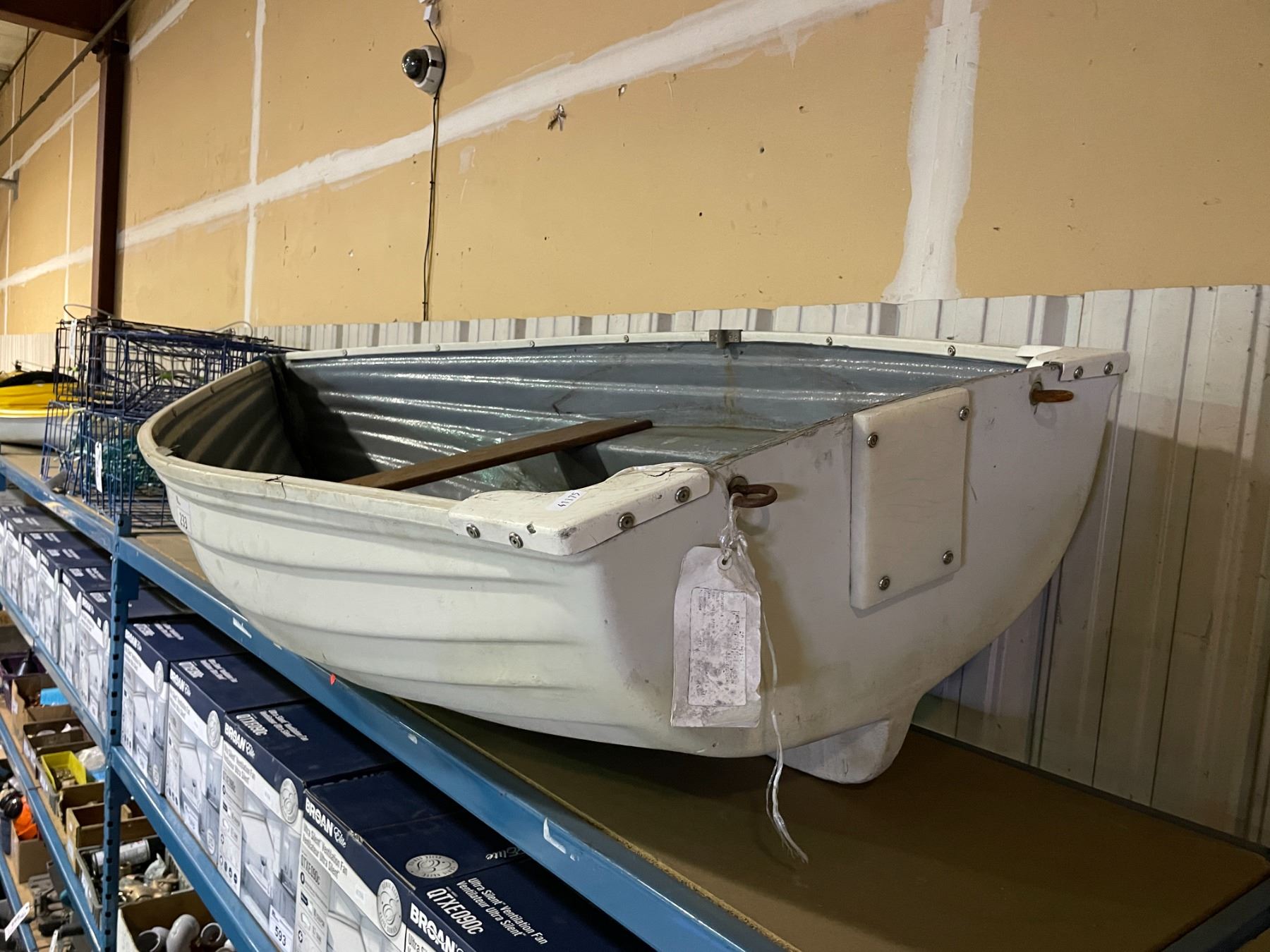 7' WHITE 2 PERSON FIBERGLASS ROW BOAT WITH WOODEN TRANSOM