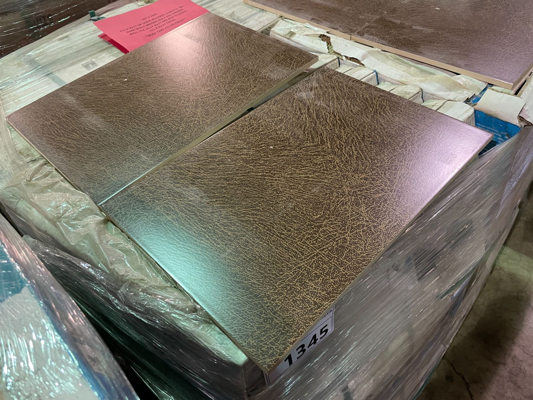 711.9 SQ FT OF LEXUS XCLUSIVE SCARLETE BR- DARK MULTI BROWN 450 X 300 CERAMIC WALL TILE 10.17 SQ FT PER BOX 70 BOXES 711.9 SQ FT TOTAL *MUST TAKE ALL ON PALLET*