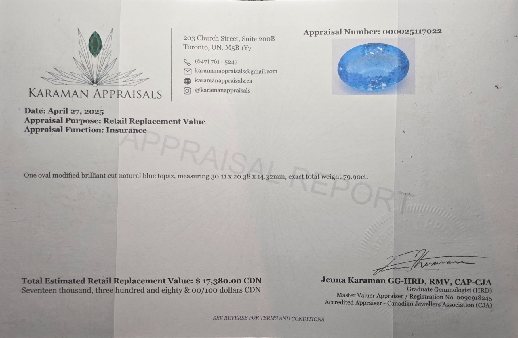 79.9 CT CERTIFIED ROYAL BLUE TOPAZ GEMSTONE ($17,380 APPRAISAL, APPRAISAL NOT GUARANTEED)